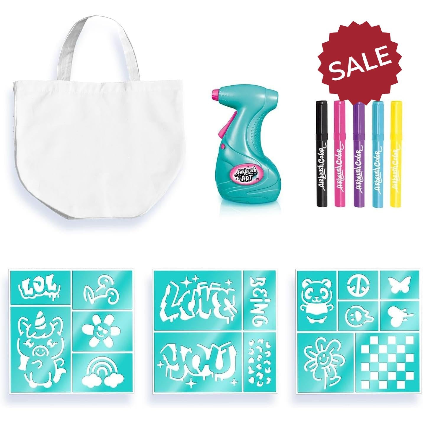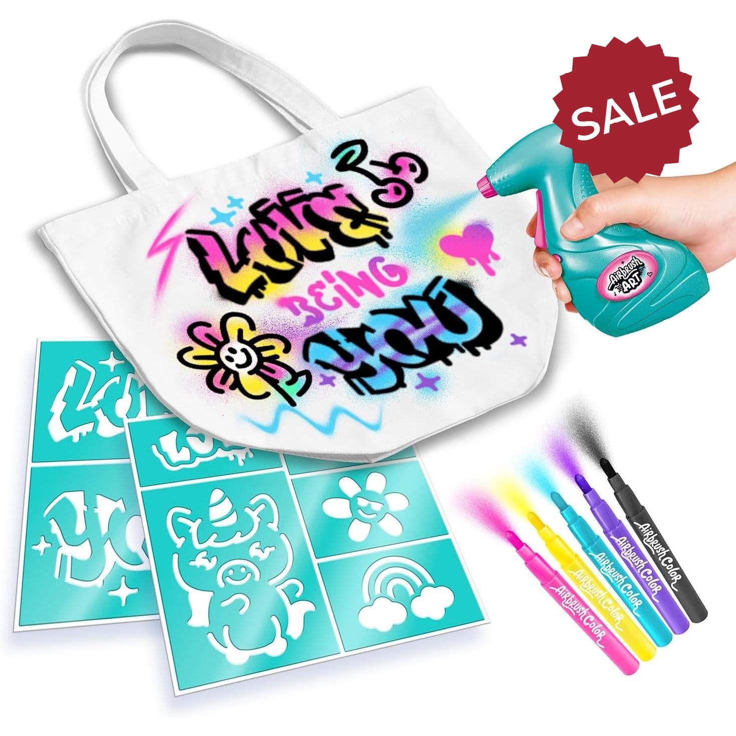 - Contents: 1 Airbrush tool, 5 Airbrush markers, 3 Stick-on stencil sheets, 1 Tote bag