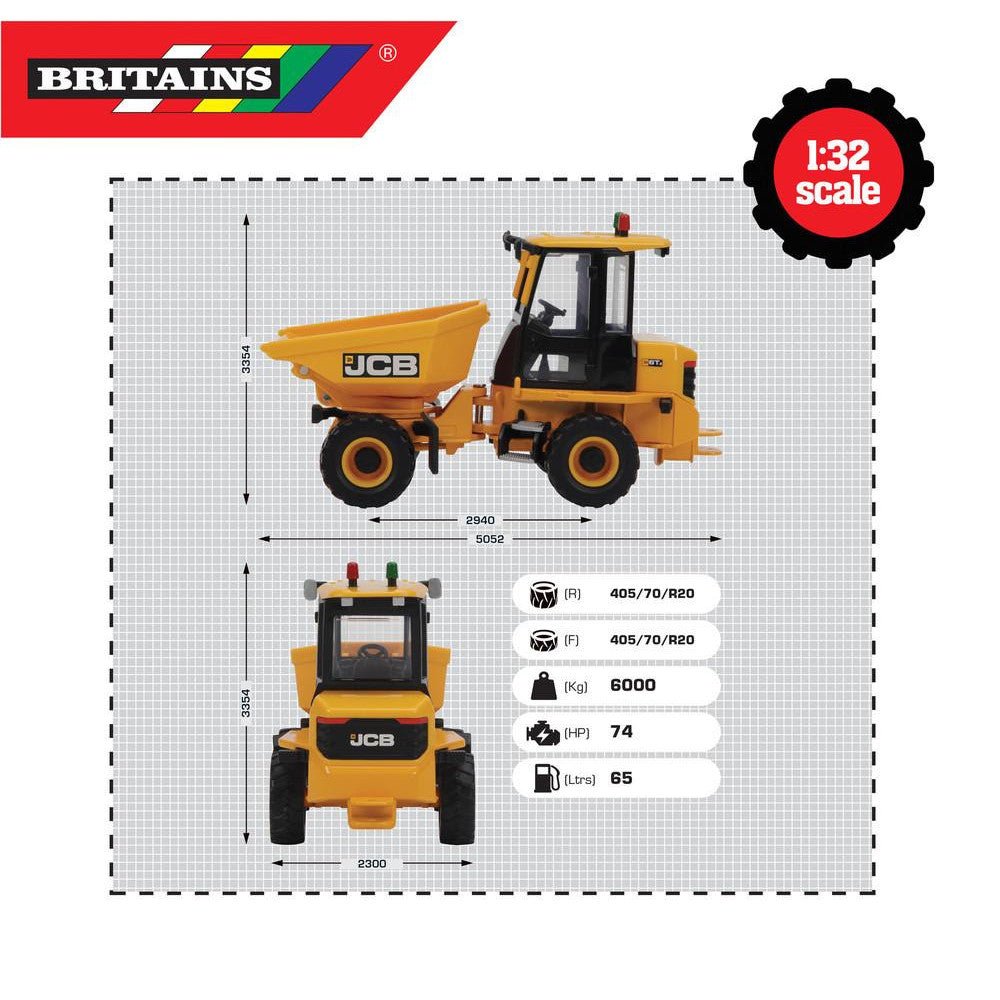 The JCB 6 tonne site dumper is guaranteed to maximise productivity wherever you deploy it. The T6 Dumper integrates JCB core componentry for maximised efficiency and performance. Britains model has captured every detail including tipping and swivel features and flat skip side designs enable effective material discharge. The JCB 6 tonne site dumper is compatible with Britains 1:32 scale machinery and accessories. Made of die cast metal and durable precision-moulded plastic. Build your toy farm world with our entire range of tractors, vehicles, implements and accessories.