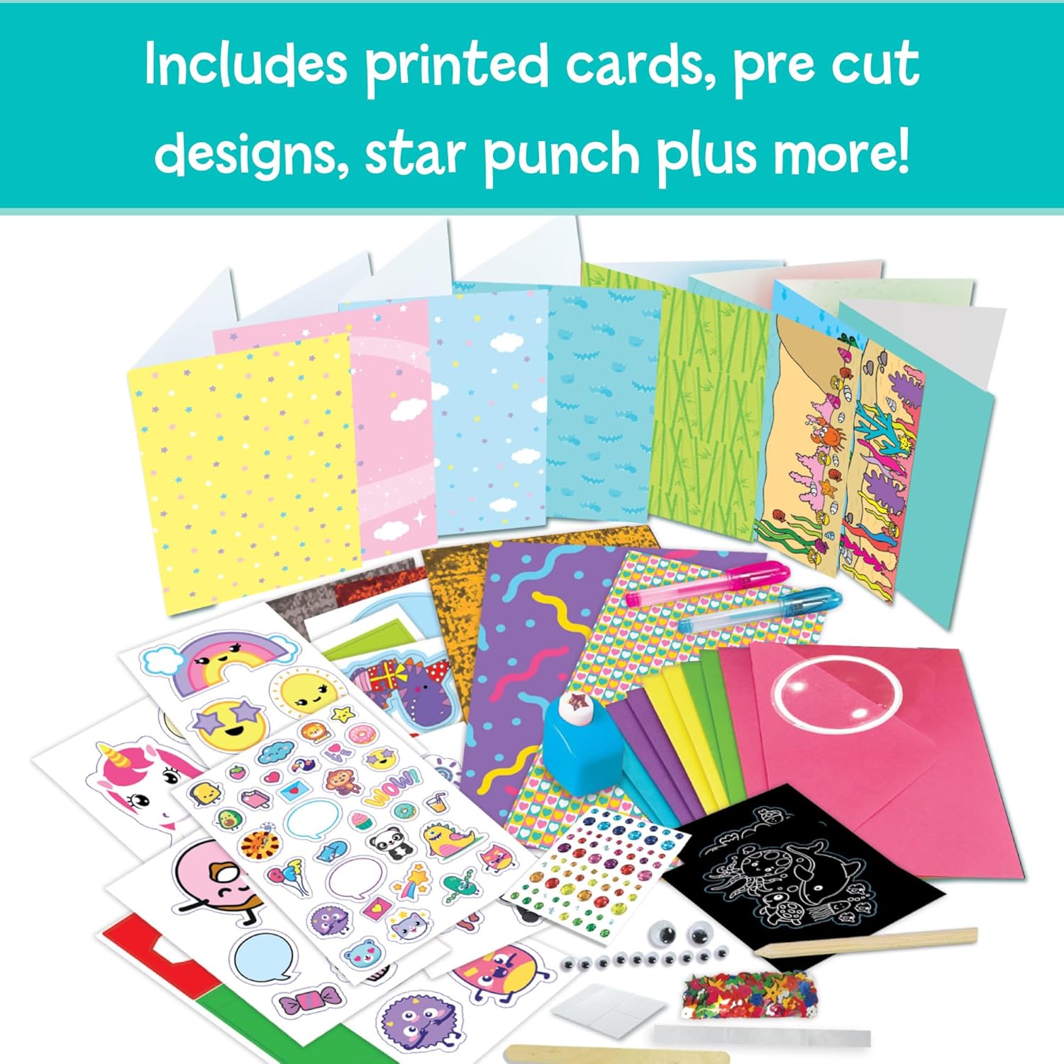 - INCLUDES 50 plus CRAFTING SUPPLIES: Packed with 8 printed cards, coloured card, envelopes, sticker sheet, scratch art pieces, sequins, foil paper, wiggly eyes, sticky gems, and more to spark endless creativity