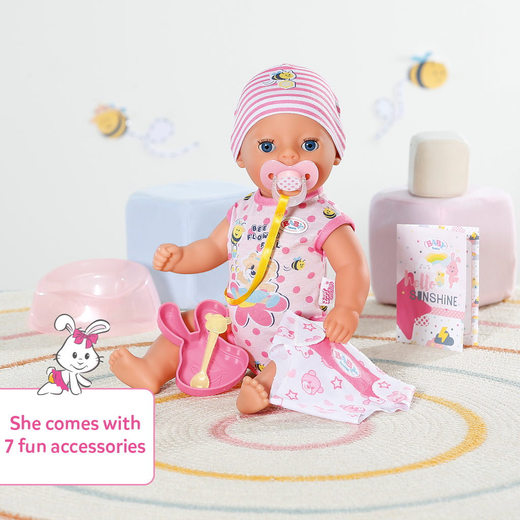- Contents: 1x BABY Born Lena doll, x1 romper, x1 hat, 1x potty, 1x cloth diaper, 1x bottle, 1x plate with spoon, 1x pacifier, 1x birth certificate