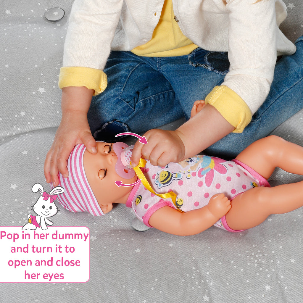 She may only be 36cm in size but BABY born Lena can drink water from her bottle, wet her nappy for changing or use her pink potty. Use her dummy to magically open and close her eyes by turning left or right. Lay her down to sleep and she’ll close her eyes without the dummy and she can even go in the bath!