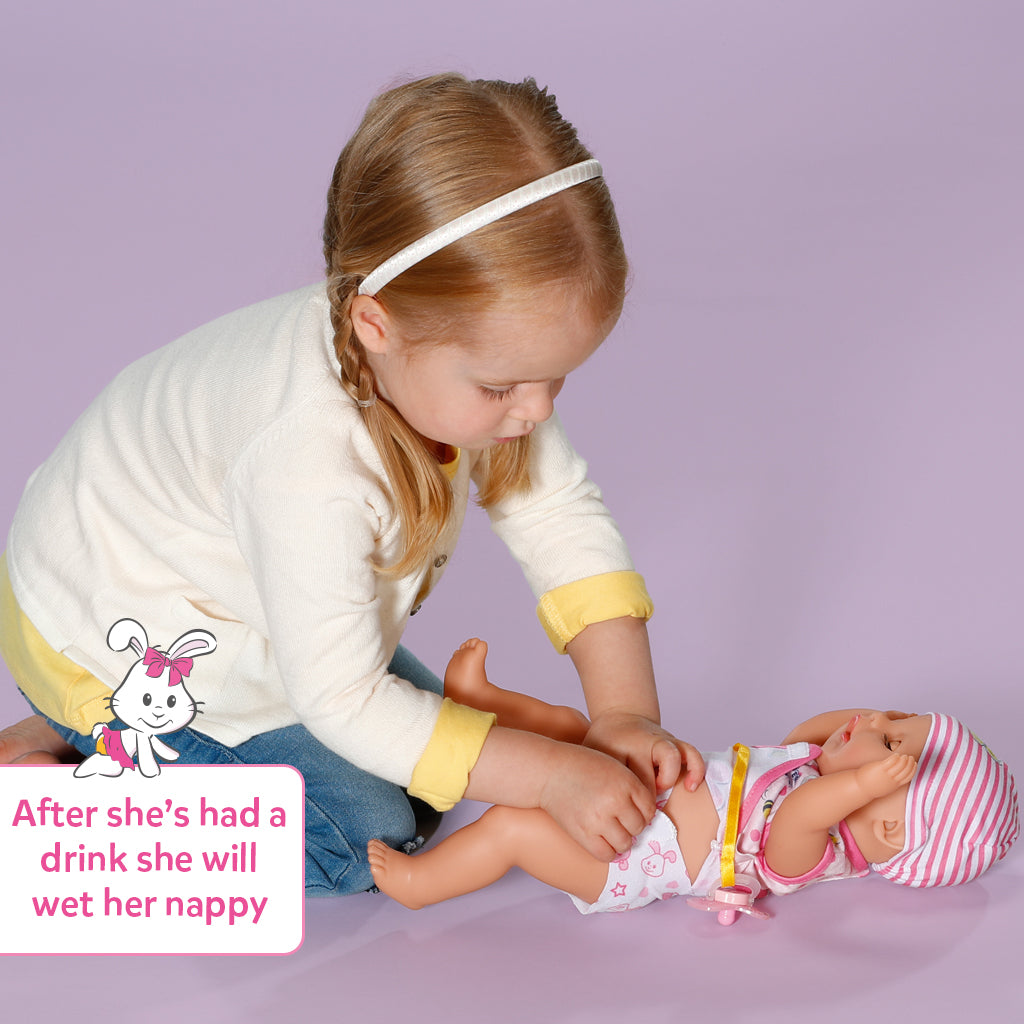 - Interactive features include drinking, wets diaper, uses potty, and sleeps