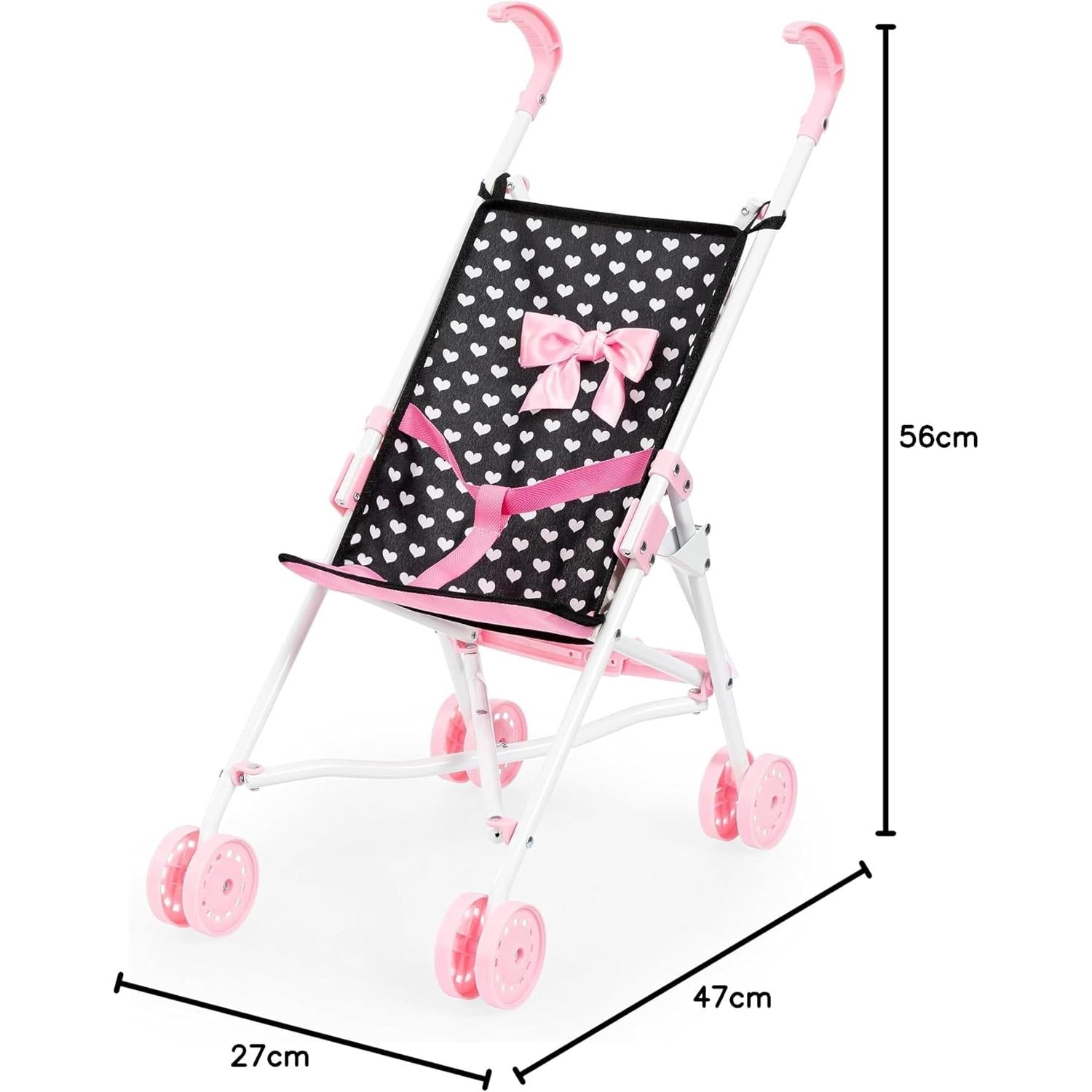 This wonderful doll’s umbrella stroller is suitable for dolls up to 46 cm. It has a lovely colour combination and is perfect for the first excursion with the doll or plush toy. The integrated belt protects the doll from falling. Thanks to its four double wheels it is easy to push. Furthermore it can be easily folded and stored.
