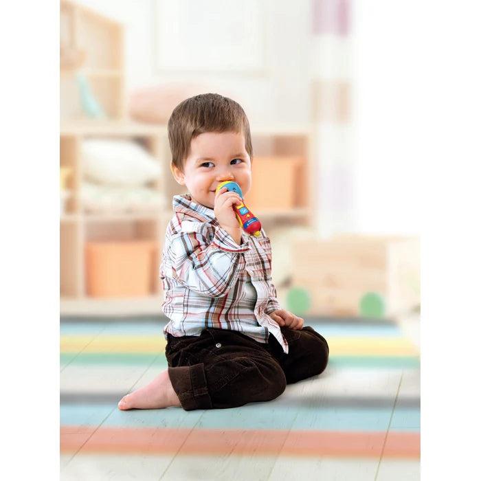 Featuring a LED light, 2 coloured keys and a button that amplifies children's voices just like a real microphone!