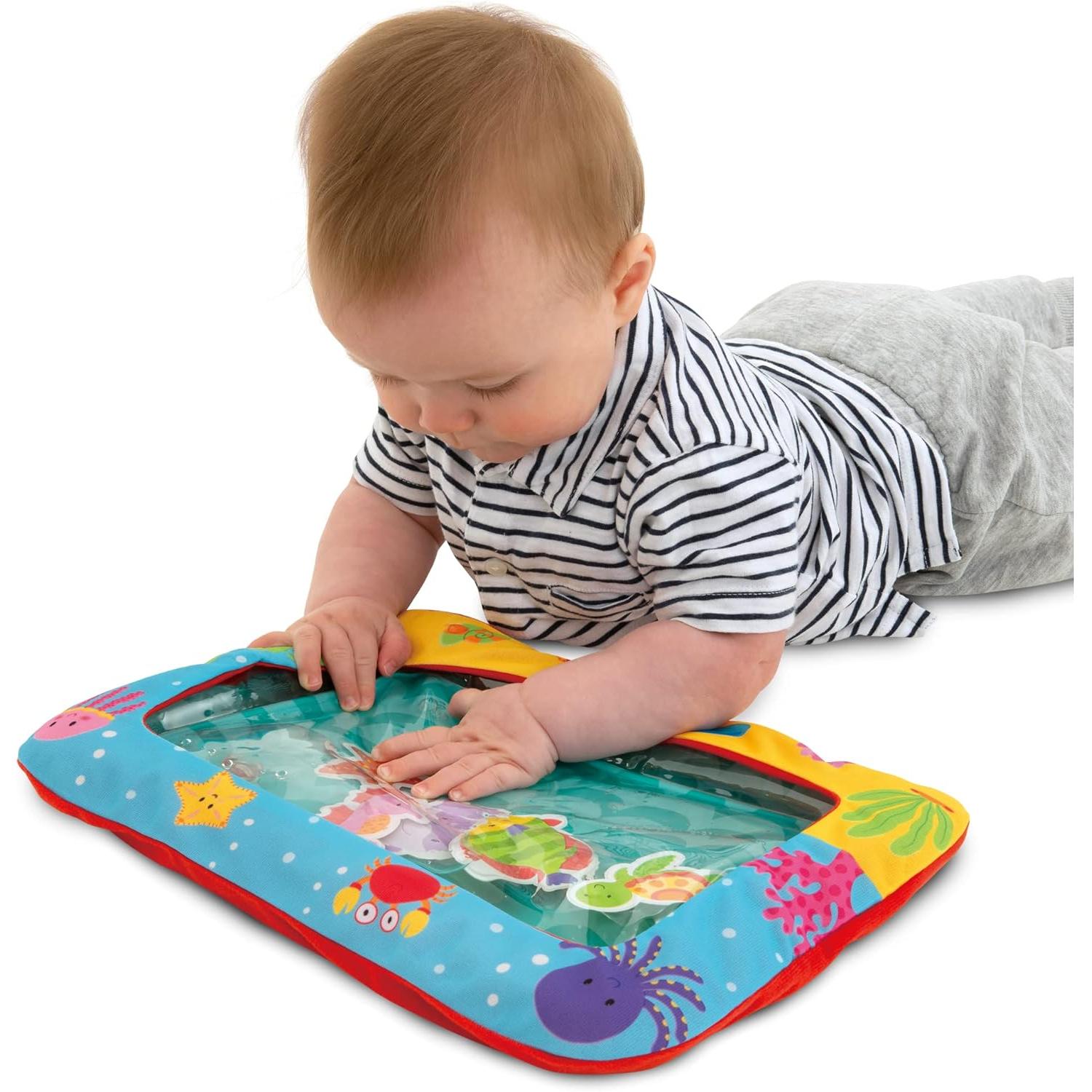 - Portable Water Playmat: This fabric covered water playmat is easy to transport and perfect for tummy time play. Encourage Early Learning: The ocean friends swim when pressure is applied to the transparent mat surface, teaching baby about cause and effect