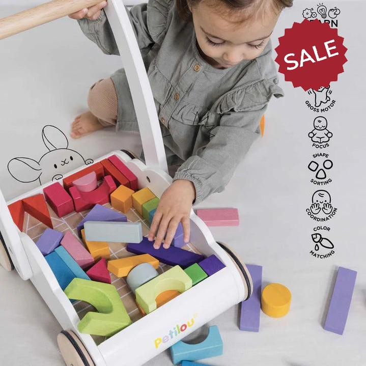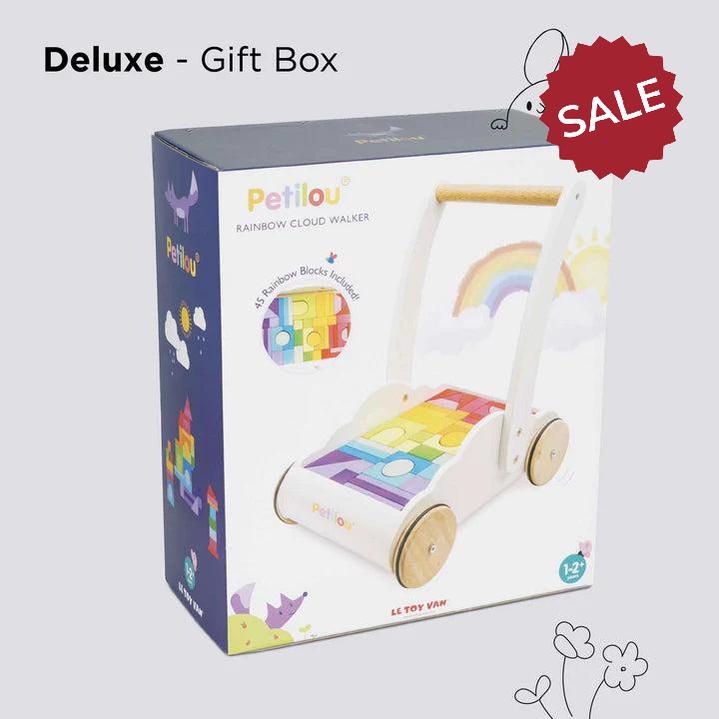 - A cloud themed wooden walker with 45 wooden rainbow blocks