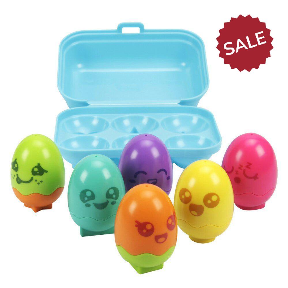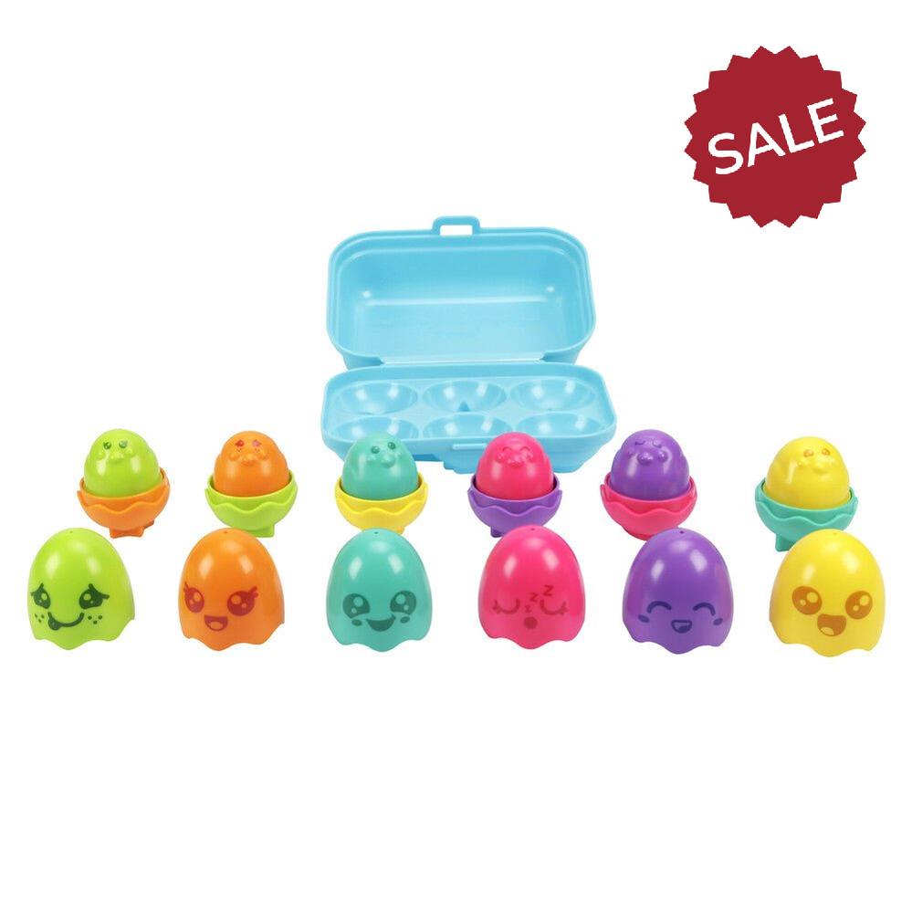 - Colour matching: Six eggs with stacking shells kids can match, either to the bases or the faces.