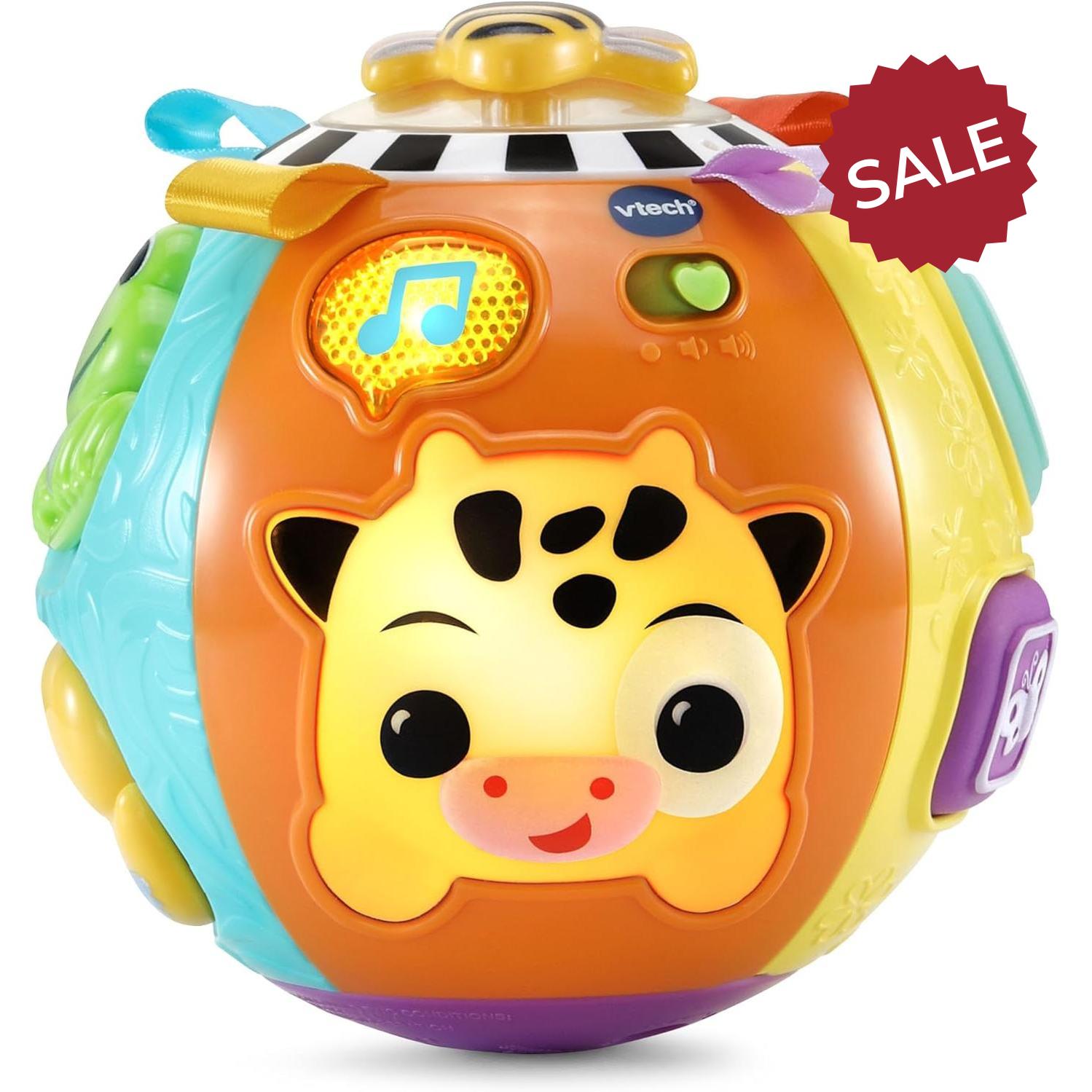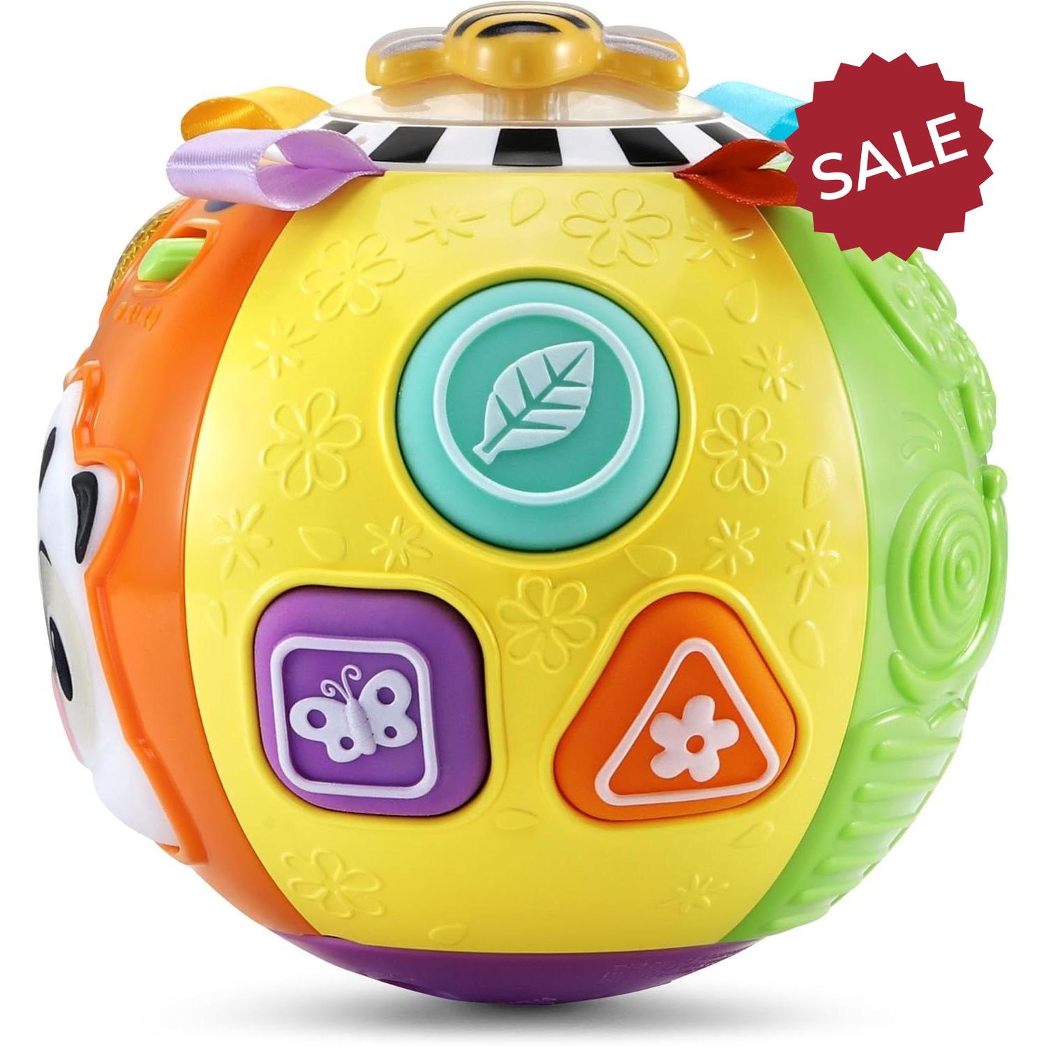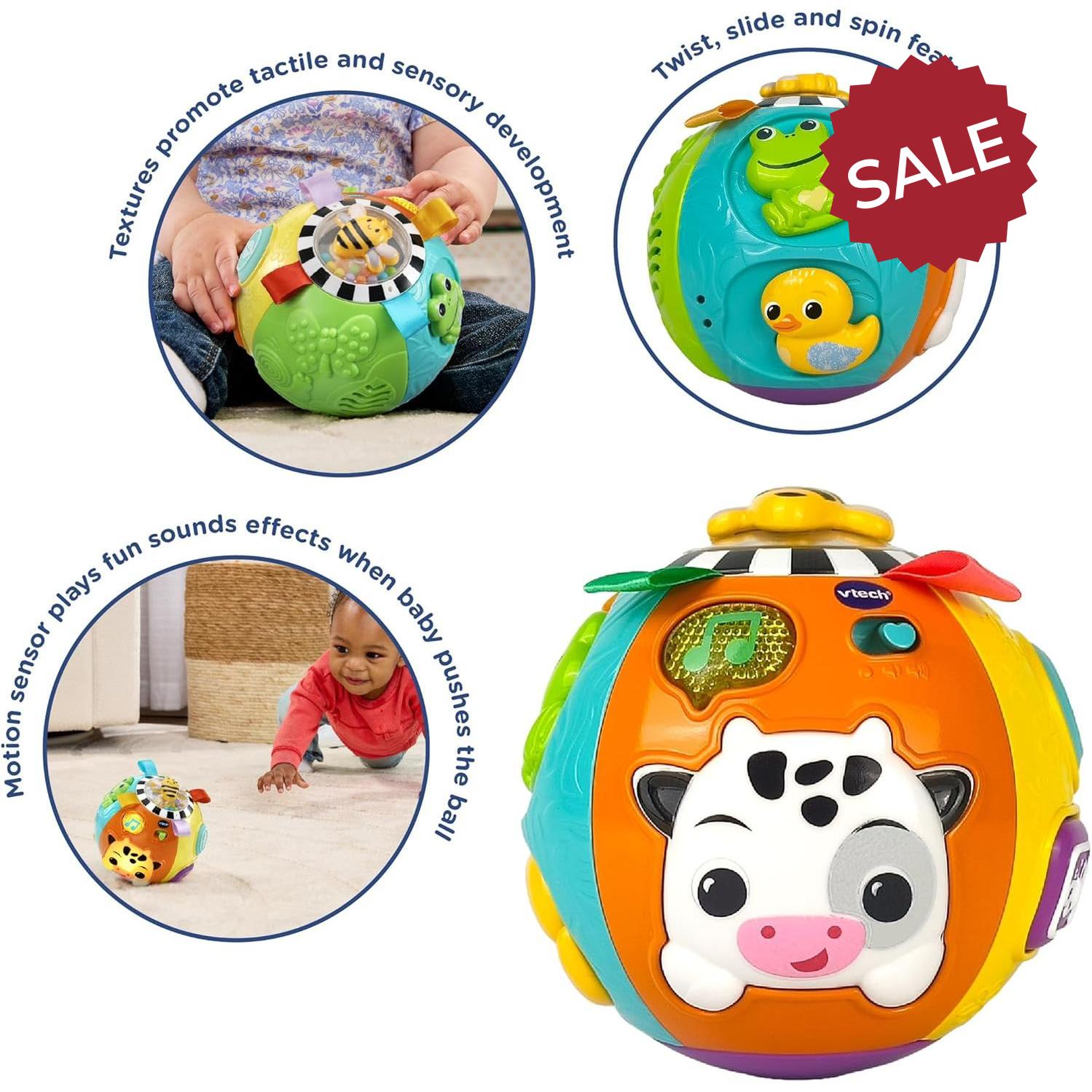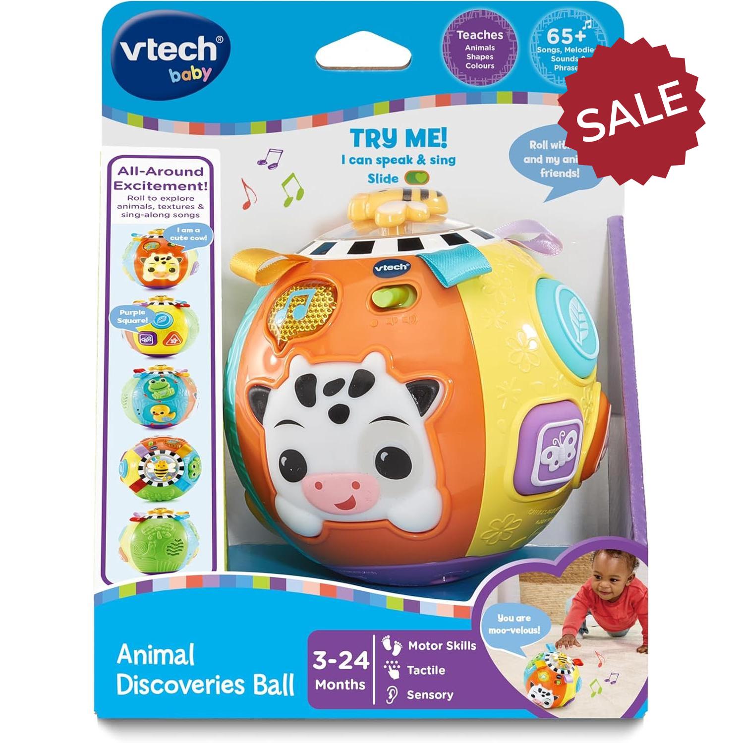 Let your baby explore a world of fun and learning with the VTech Animal Discoveries Ball! This interactive toy offers five sides of engaging play, combining electronic and hands-on activities. The cheerful cow button introduces fun phrases, while the music button lights up and plays delightful sounds. Press the soft shape buttons to learn shapes and colors, perfect for early learning.