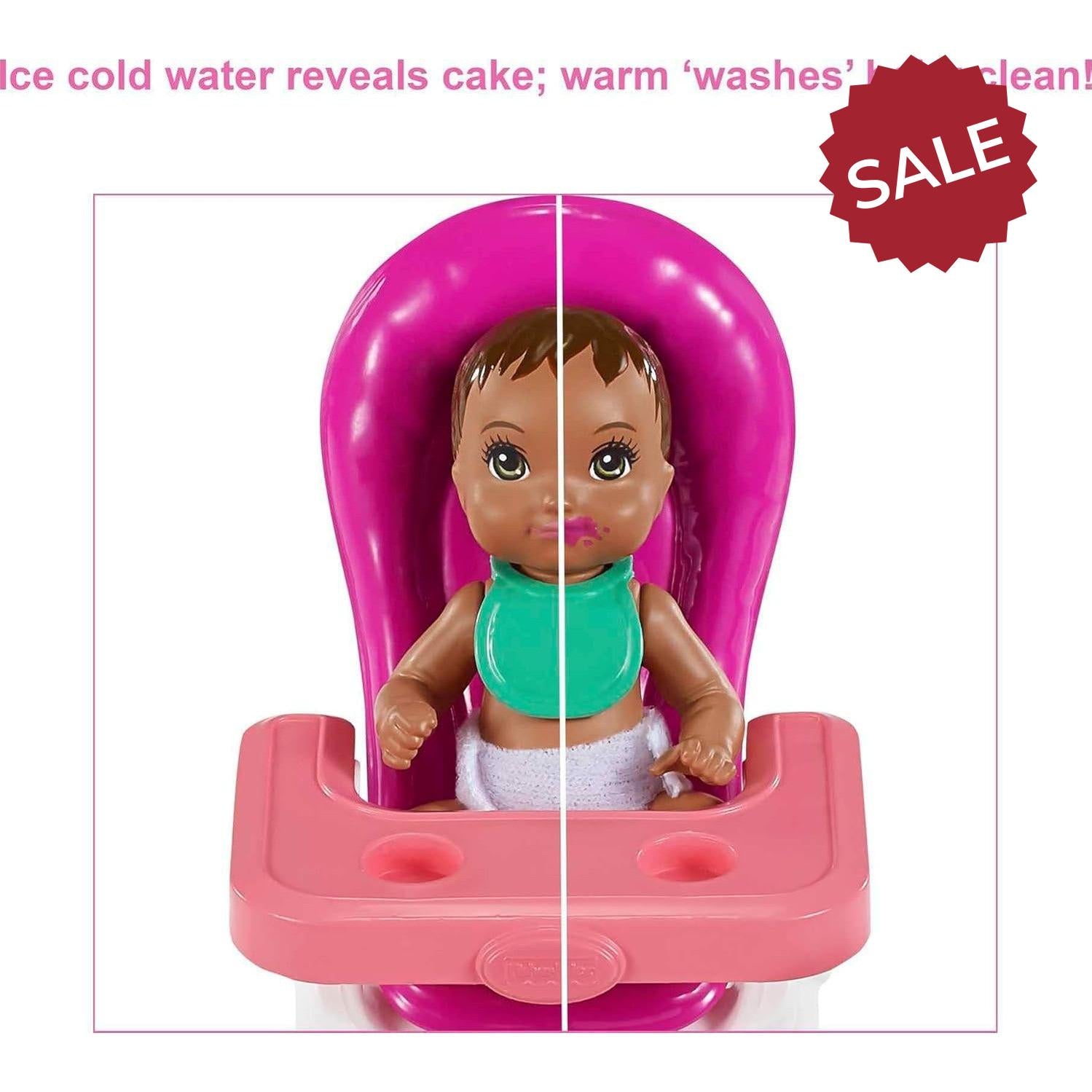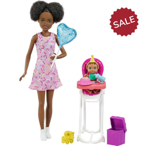 Barbie® Skipper™ Babysitters Inc.™ dolls and playsets let kids explore their nurturing side as the babysitter. This party-themed set lets kids celebrate any occasion with cake that baby can 'eat' in her high chair. Kids can use ice-cold water to see cake appear on the baby doll's face; then use warm water to clean up! A gift that opens to reveal a toy train and other party accessories encourage nurturing and storytelling. With so many pieces in this playset, there are endless babysitting adventures to imagine. Kids can collect all the Babysitters Inc.™ dolls and toys for more babysitting fun with Barbie® (each sold separately, subject to availability). Skipper™ doll cannot stand alone. Colors and decorations may vary.