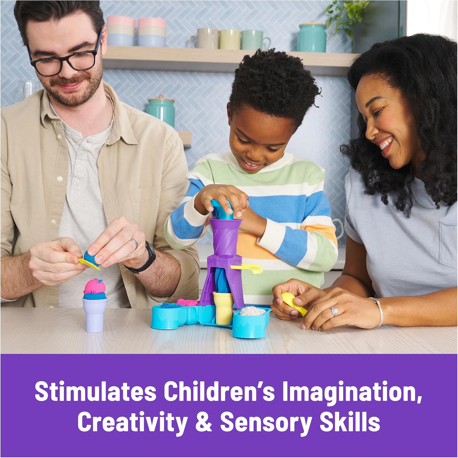 - MAKE ICE-CREAM SWIRLS: Kids can scoop, swirl and decorate their own soft serve-inspired creations with 3 colours of Kinetic Sand, 2 ice-cream cones, a scoop with sweet treat moulds and a tool for toppings