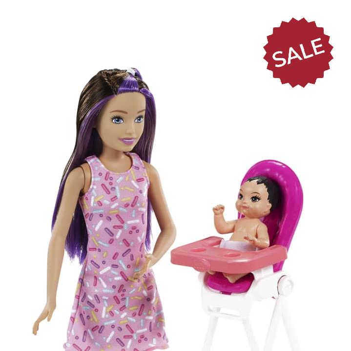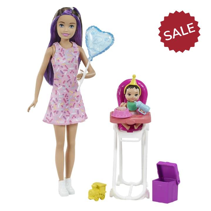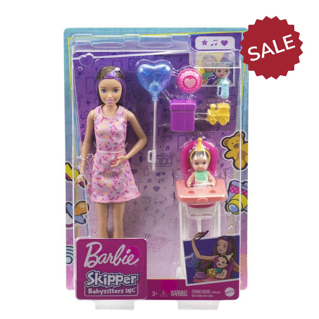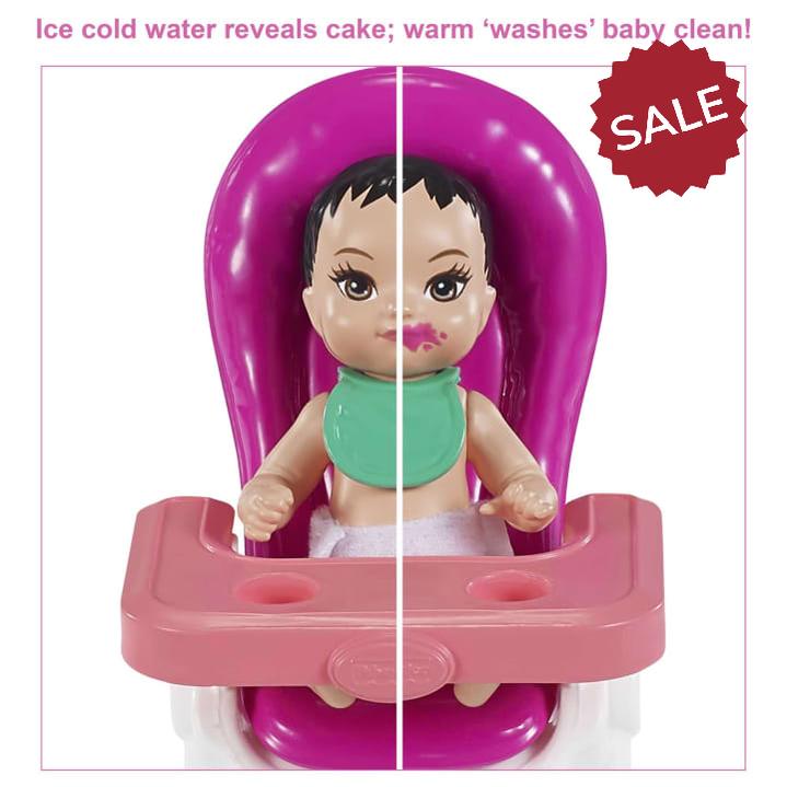 Barbie® Skipper™ Babysitters Inc.™ dolls and playsets let kids explore their nurturing side as the babysitter. This party-themed set lets kids celebrate any occasion with cake that baby can 'eat' in her high chair. Kids can use ice-cold water to see cake appear on the baby doll's face; then use warm water to clean up! A gift that opens to reveal a toy train and other party accessories encourage nurturing and storytelling. With so many pieces in this playset, there are endless babysitting adventures to imagine. Kids can collect all the Babysitters Inc.™ dolls and toys for more babysitting fun with Barbie® (each sold separately, subject to availability). Skipper™ doll cannot stand alone. Colors and decorations may vary.