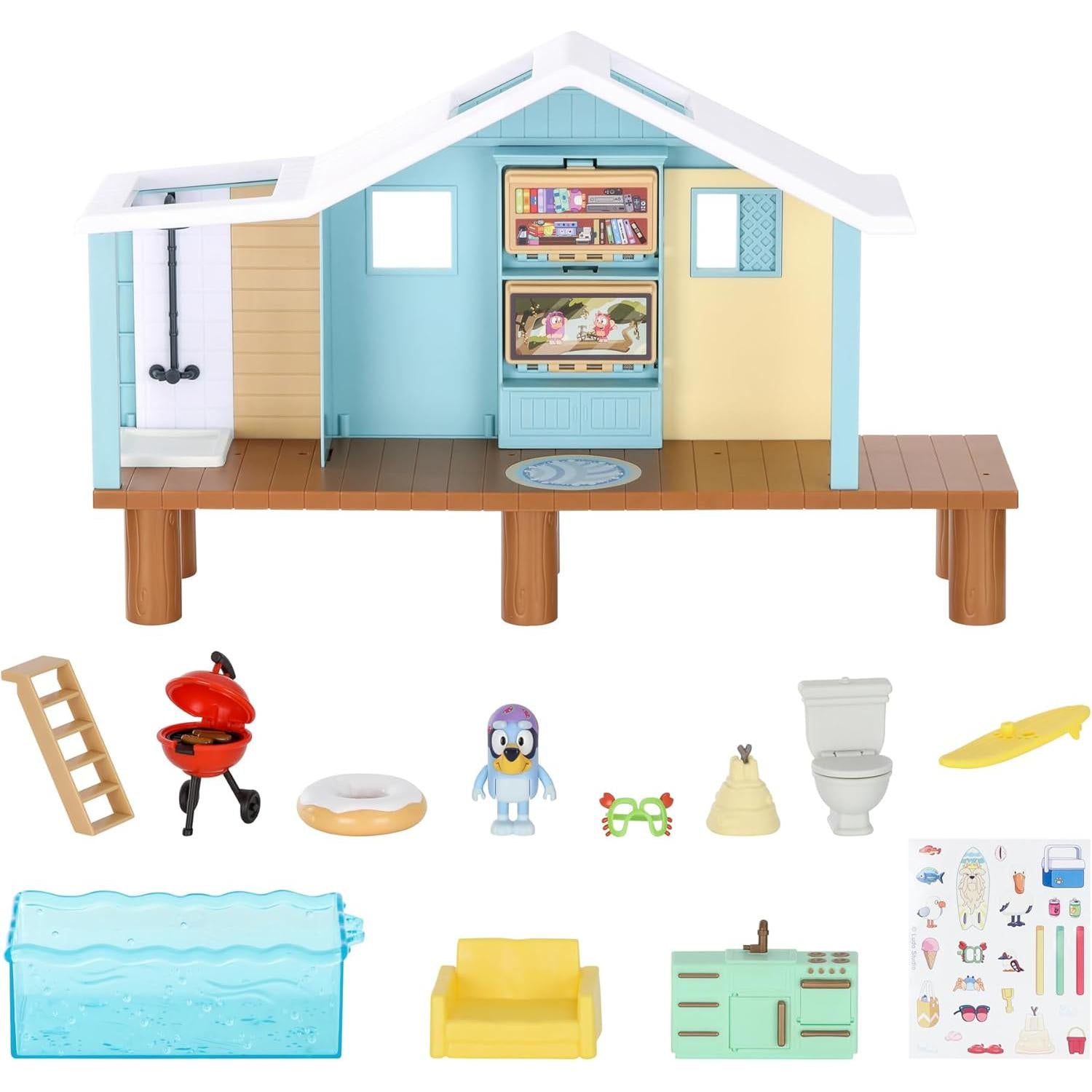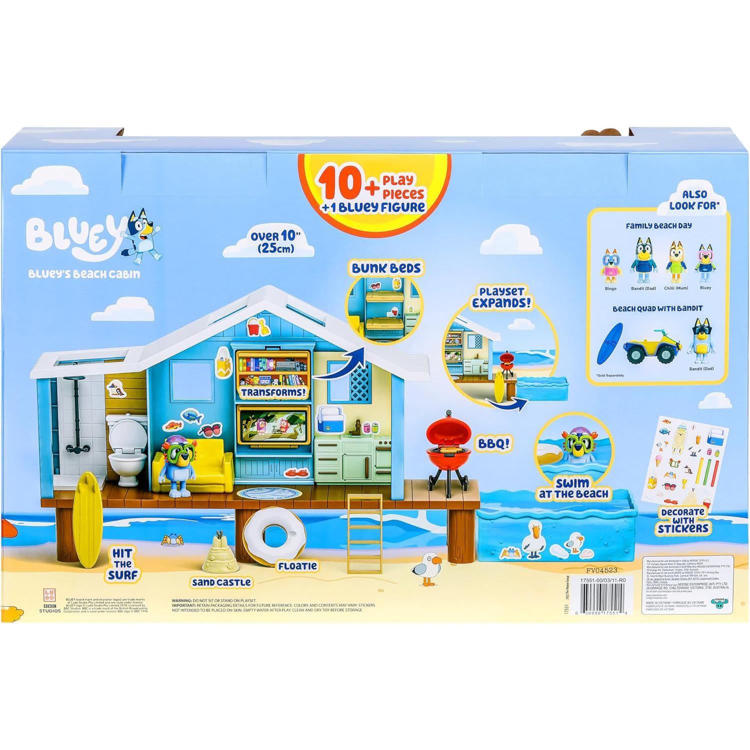 They will love exploring the cabin with its toilet and shower, kitchen, deck and a lounge that converts to a bedroom when they pull down the shelves and TV! Plus this playset expands out to include its own beach for Bluey to swim in. Thank goodness she's wearing her goggles! With more than 10 different play pieces including a surfboard, sand castle, BBQ and floati.