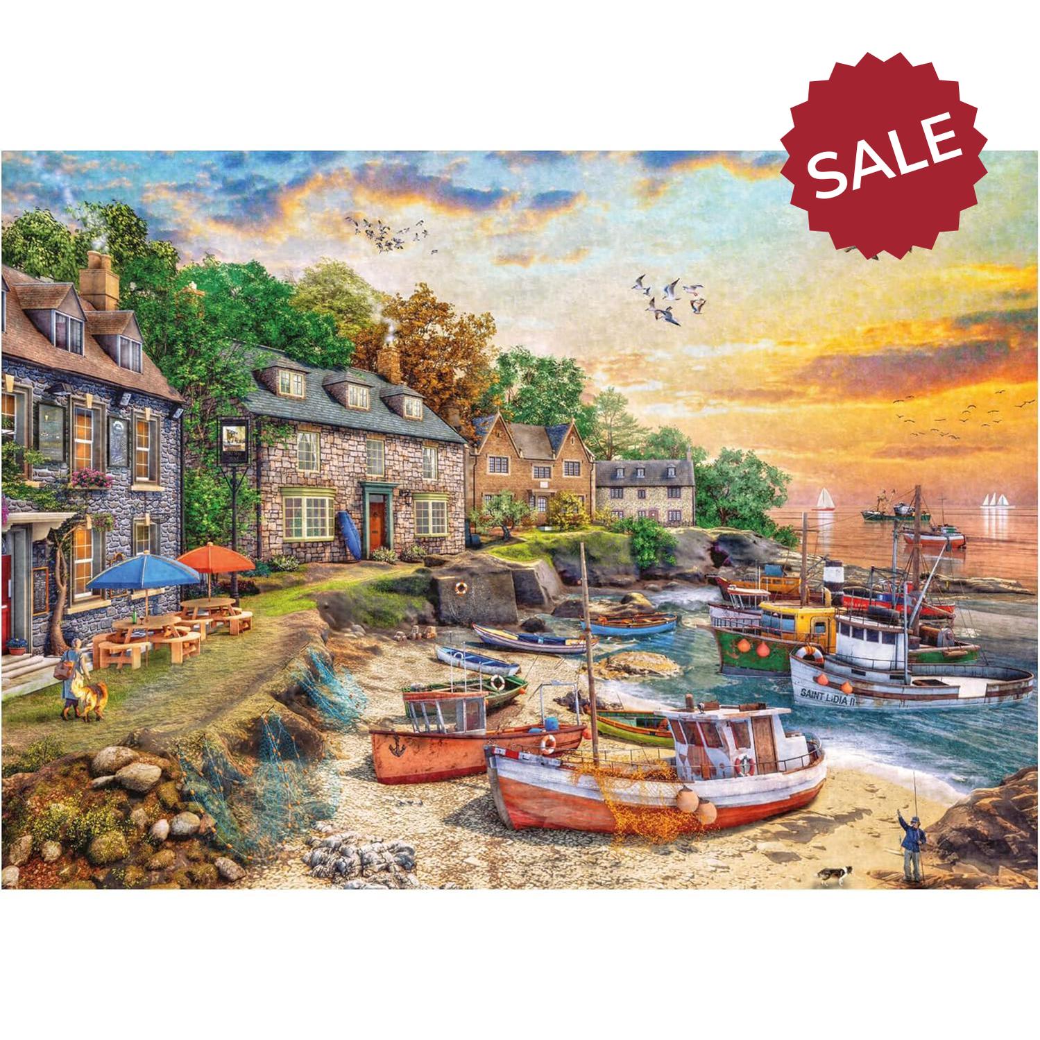 Harbour Cottages is the title of this beautifully illustrated 1000-piece Falcon de luxe jigsaw puzzle, which is part of the Falcon Cottages puzzle theme. This magical image transports puzzlers to a quaint, coastal town at sunset where stone cottages hug the coastline, fishing boats line the bay and the sun glistens across the tranquil water. This stunning 1000-piece jigsaw puzzle has been illustrated by the talented artist – Dominic Davison. This puzzle has been produced using high-quality recycled board to ensure every jigsaw piece maintains its original shape and creates a poster-like finish.