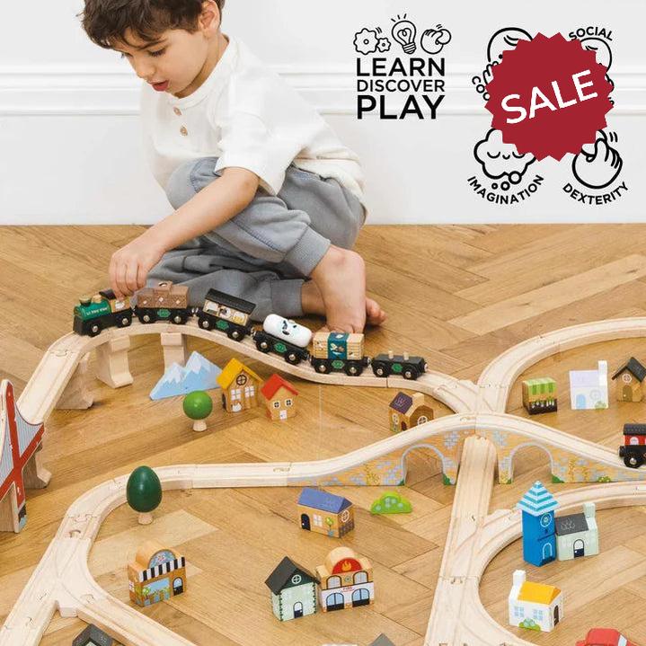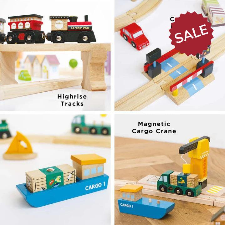 Take a ride on the Royal Express. This stunning wooden train set is ready for adventures.  A true classic, this timeless toy makes an exciting gift for any little locomotive fan. With a whopping 180 pieces, endless day after day play awaits. Featuring 2 connectable trains complete with an extensive collection of rubberwood tracks. Accessories include a Ferris wheel, 2 bridges, a car, a truck, a train station, a crane, boats, a variety of buildings, shops, houses and 3D outdoor elements.