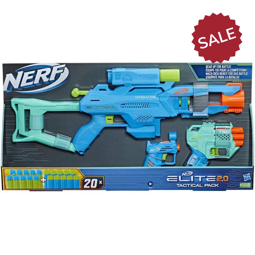 - Gear Up For Battle With This 3-Blaster Set: The Nerf Elite 2.0 Tactical Pack Includes 3 Nerf Elite 2.0 Blasters And 20 Nerf Elite Darts! Build Your Nerf Blaster Collection With These Fun Blasters.