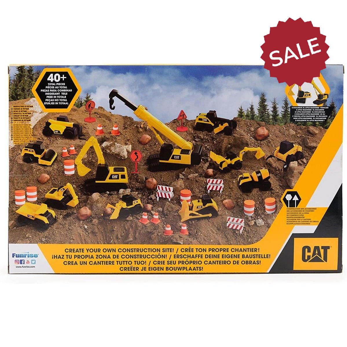 The Cat Little Machines Mega Set is packed with everything needed for getting big construction site jobs completed. With over 40 pieces in total, it includes an assortment of Little Machines vehicles, exclusive XL Little Machines crane and excavator perfect for transport and digging, and various construction site accessories such as road signs, cones, barrels, and boulders.