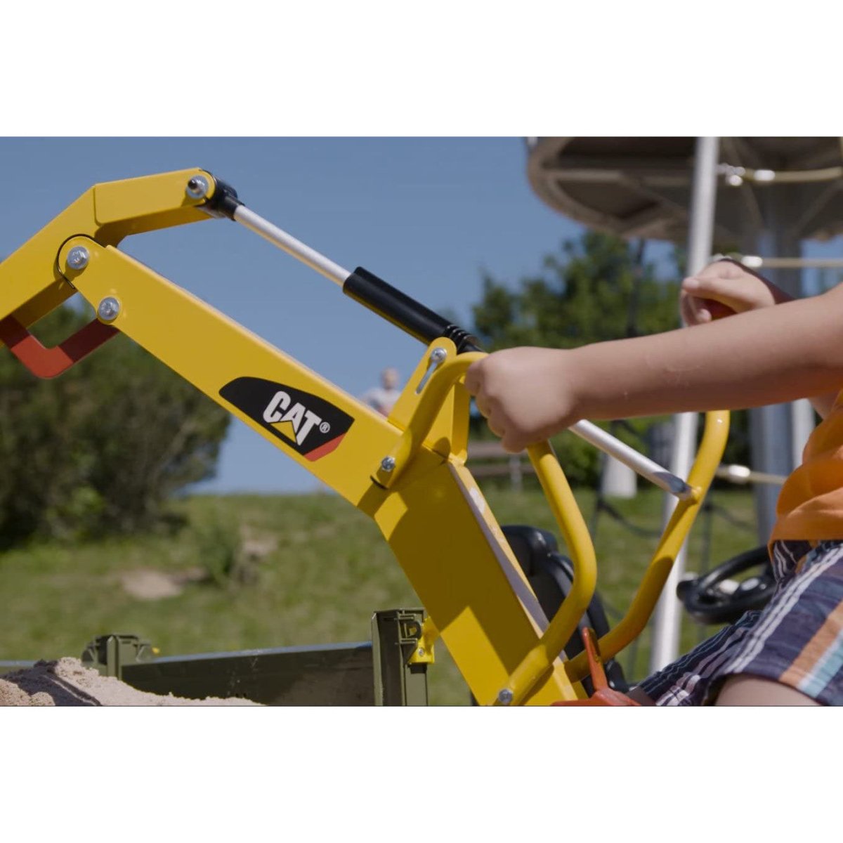 This giant "sit on" CAT licensed excavator has stylish tracking for wheels. It also has a 360 degrees turning circle with a metal digger mechanism, just like the real thing. It has a locking arm device and can be used on earth and sand.