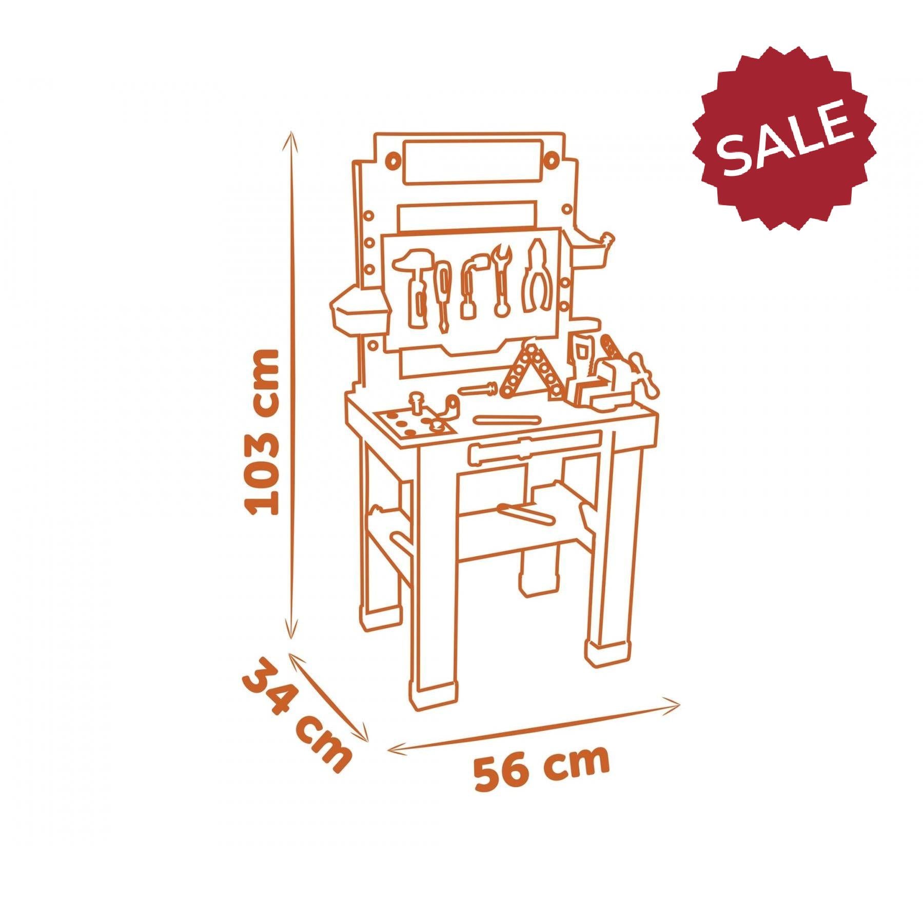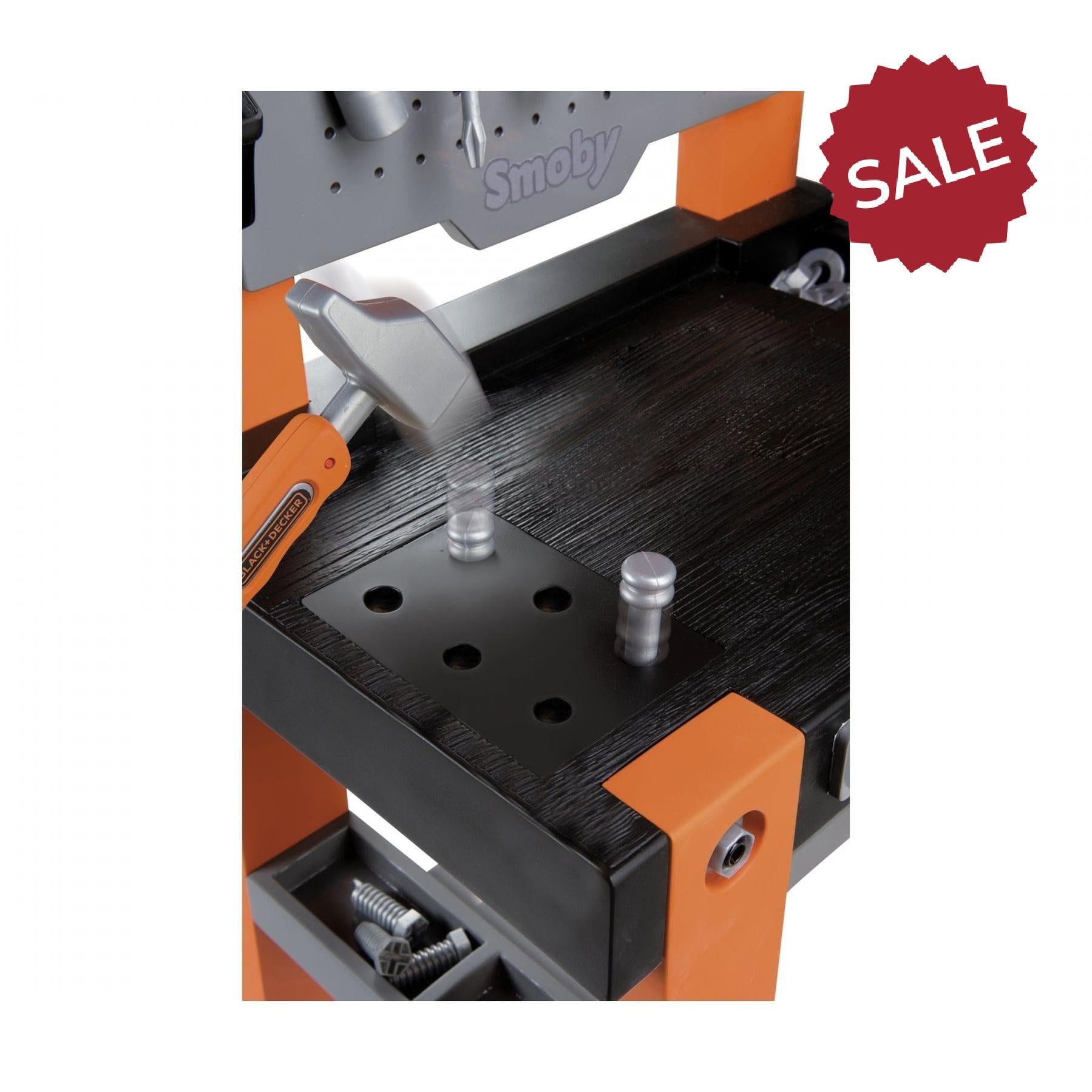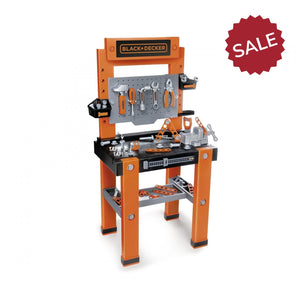 The Black+Decker workbench comes with a wealth of equipment. 7 different tools provide realistic handyman fun: hammer, screwdriver, pliers, wrench, Allen key, a screw clamp and an adjustable ruler at the front. The many screws and nails can be easily stowed away in the many large and small storage compartments, so everything stays neatly in place even after the DIY job is done. Fun nail function hit a nail and another one comes out!