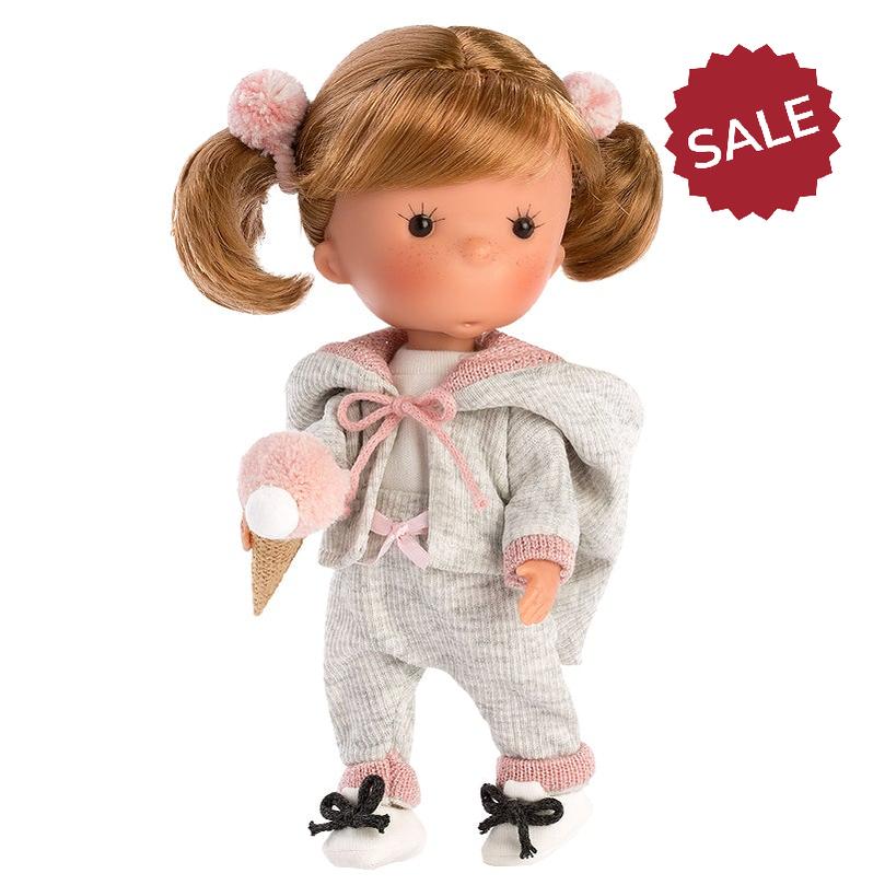 They are small, they are fun, the Miss Minis of Llorens are here to become your best friends! Miss Pixi Pink wears a cute grey and pink tracksuit with a hood, and pink pom-poms in her hair.