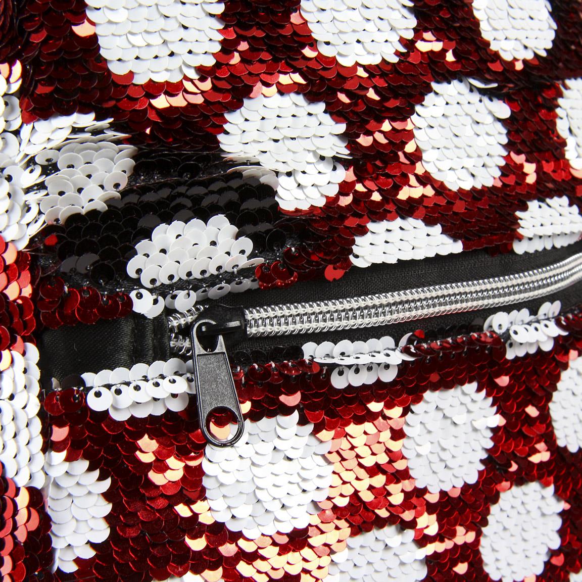 • Reversible red, white and black sequin Minnie Mouse design with ears and large shiny red bow