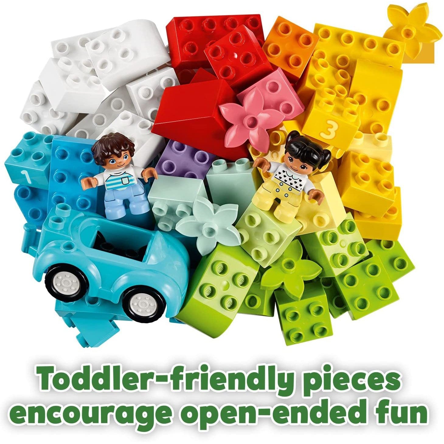 This fun-filled developmental toy is packed with bricks and pieces that encourage toddlers to explore hands-on creativity and imaginative play. Familiar objects stimulate young minds and colorful shapes invite free-building fun, making this LEGO® DUPLO® starter set the perfect way to inspire any young builder. Educational toy for toddlers! Inside the sturdy storage box, you'll find a car with moving wheels, a roof, window, flowers, bread, DUPLO people figures, 1,2,3 numbered bricks… along with an assortment of original bricks in a rainbow of inviting colors. As parents share the joy of combining the bricks and pieces into endless imaginative play possibilities, they experience first-hand their little builder’s precious developmental milestones. Great gifts for preschoolers! DUPLO playsets put open-ended play and self-expression into the hands of budding builders. With colorful, easy-to-hold pieces that excite toddlers' imaginations, they're safe, clean and easy to take wherever you go.