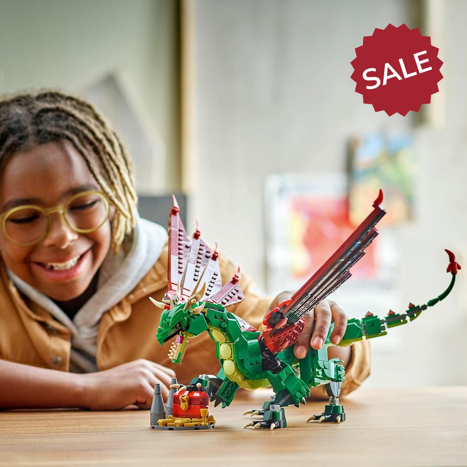 Delight your little time traveler with this LEGO® Creator Medieval Dragon (31161) creature toy playset. Featuring a dragon figure that lets boys and girls aged 9 and up role-play thrilling medieval action, it has a pair of large posable wings that move up and down and fold in and out, as well as posable ankles, toes, neck, jaw, hips and shoulders. It also comes with a treasure chest for added play value.