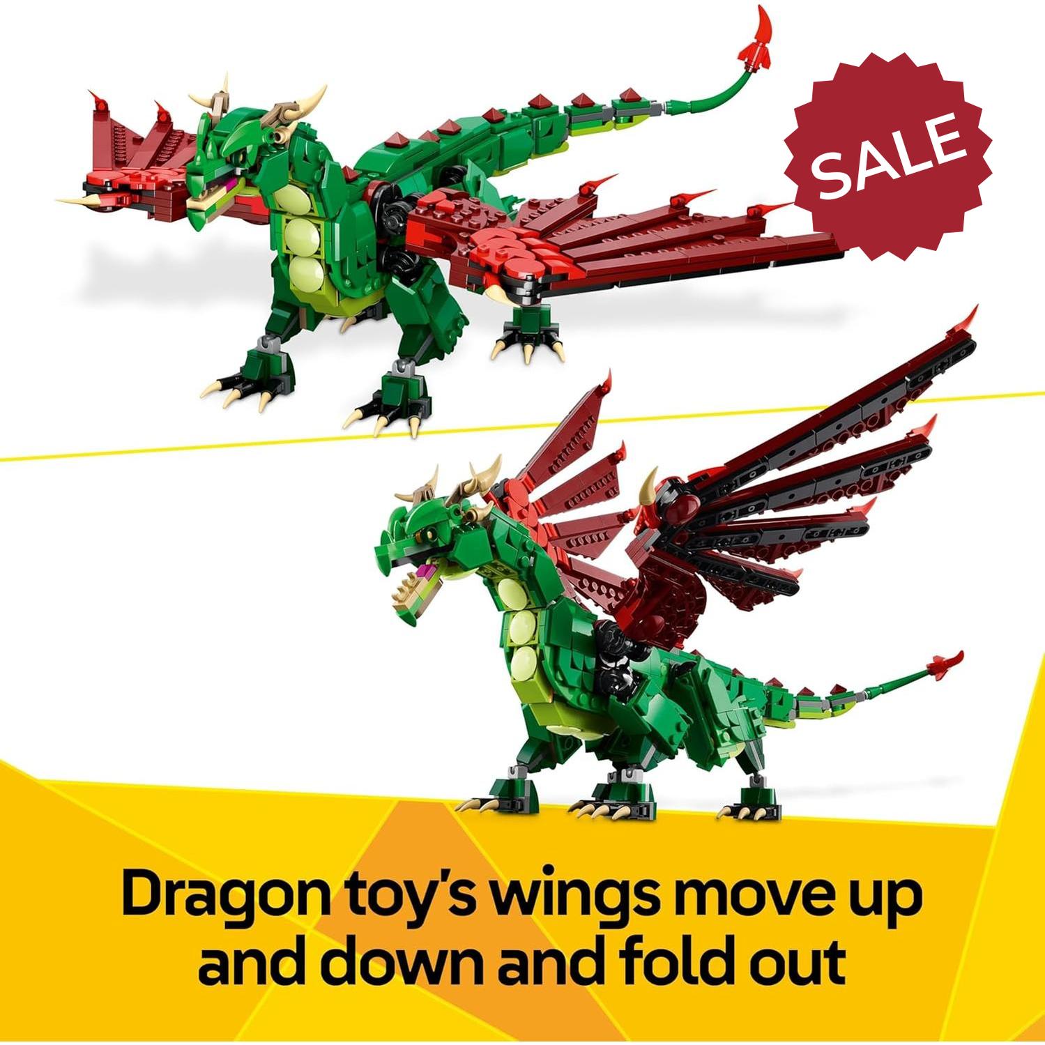 - 3 medieval creature toys in 1 box – The LEGO® Creator 3in1 Medieval Dragon toy lets boys and girls aged 9 and up build and rebuild 3 different fantasy animal toys using the same bricks