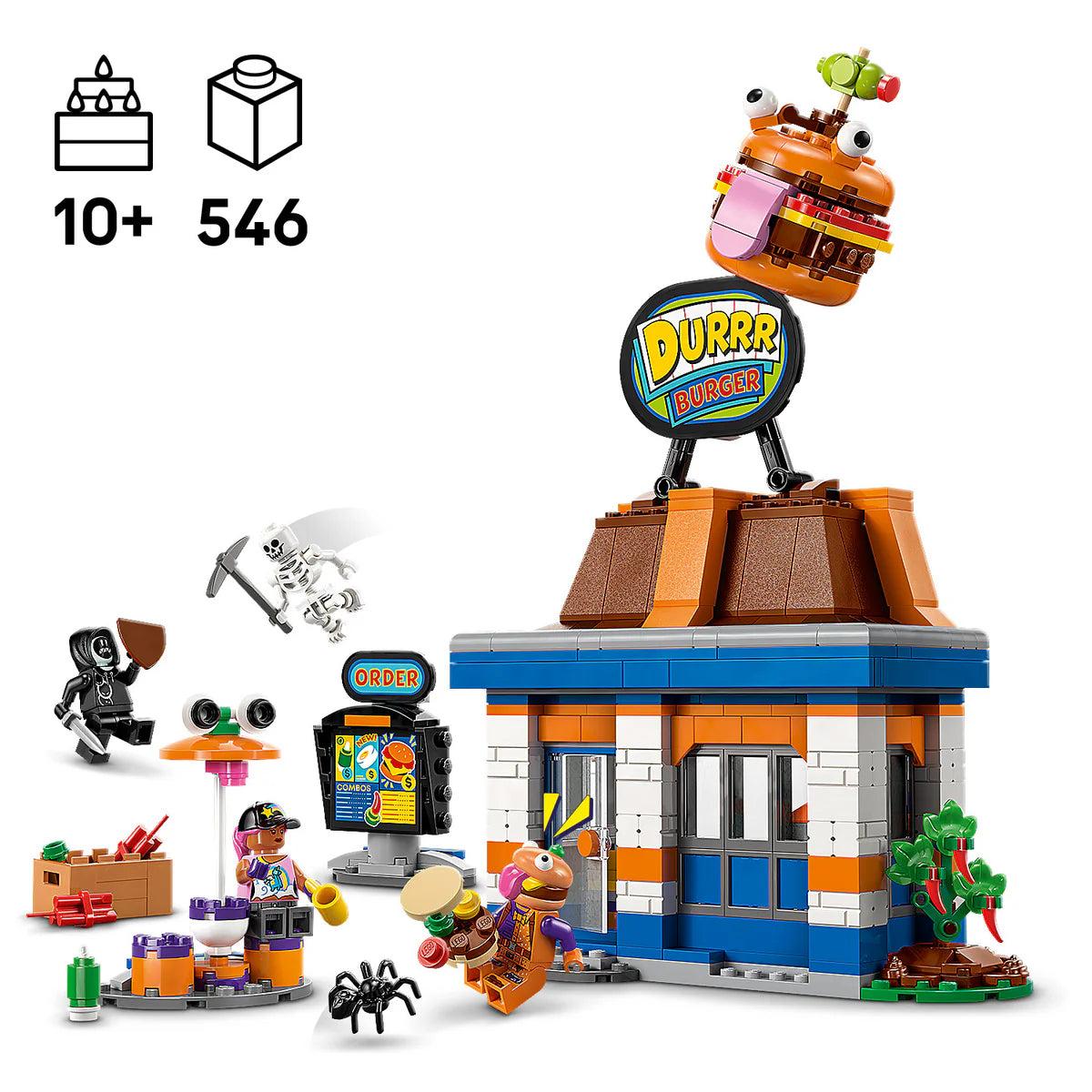 • Durrr Burger restaurant model – Feed imaginations with the LEGO® Fortnite® Durrr Burger Restaurant building set for kids aged 10 and up