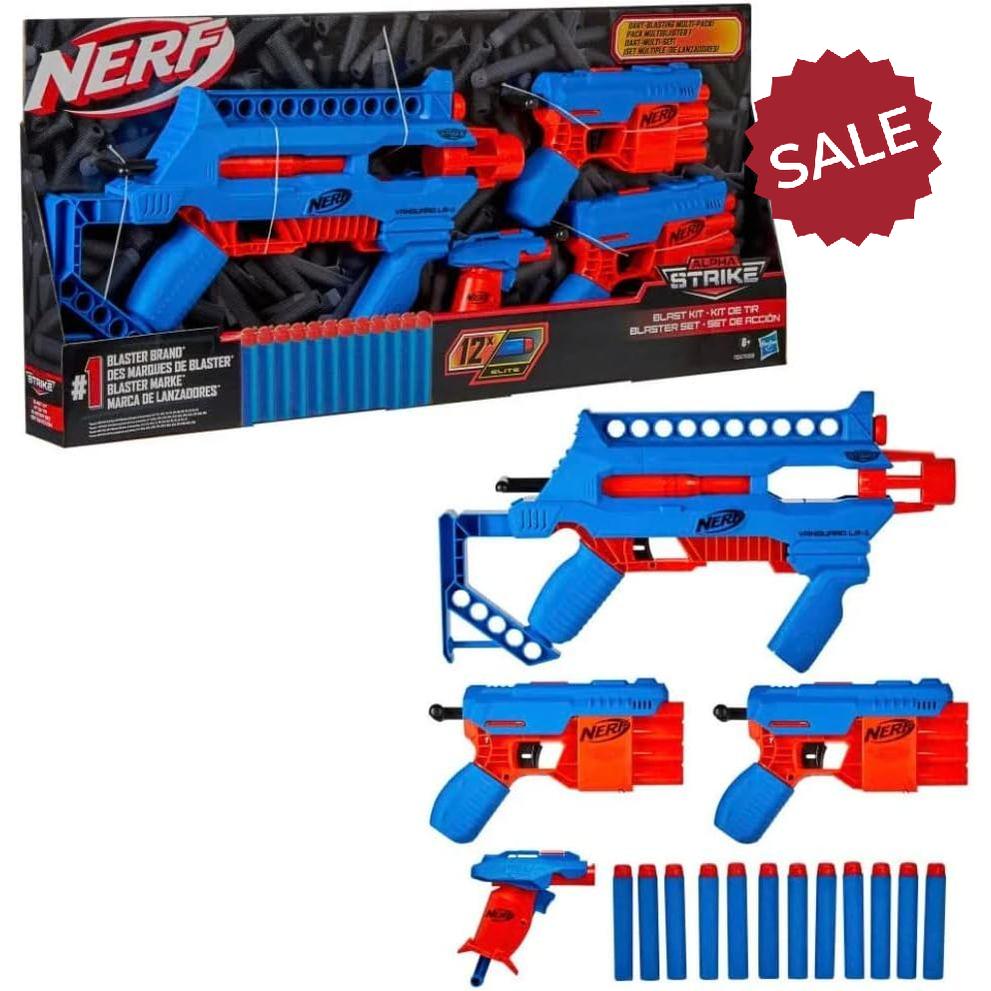 The Nerf Alpha Strike Blast Kit is a dart-blasting multi-pack that includes 4 blasters and 12 Nerf darts. The 2 Claw QS-4 blasters fire 4 darts in a row, the single-fire Vanguard LR-1 blaster has onboard storage for 10 darts, and the stealth-sized Slinger SD-1 blaster fires 1 dart at a time. They load, prime, and fire in a few quick steps. This kit includes 12 Official Nerf Elite foam darts, enough to load all 4 blasters. Alpha Strike blasters are an awesome way to get into adrenaline-pumping Nerf battles and experience the power and performance of Nerf, the number one blaster brand*. Alpha Strike blasters are easy to use so first-time players can begin blasting fast. If you’re already a Nerf fan, these blasters are great additions to Nerf collections!