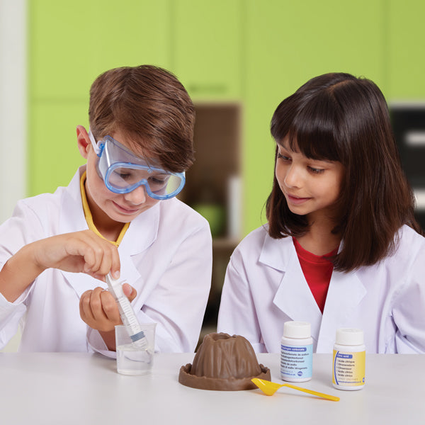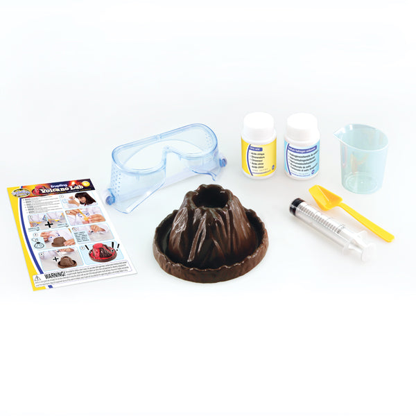 Contains the chemicals to carry out the experiment, volcano base, safety goggles, measuring cup, spoon and syringe. Not suitable for children under 8 and adult supervision is required.