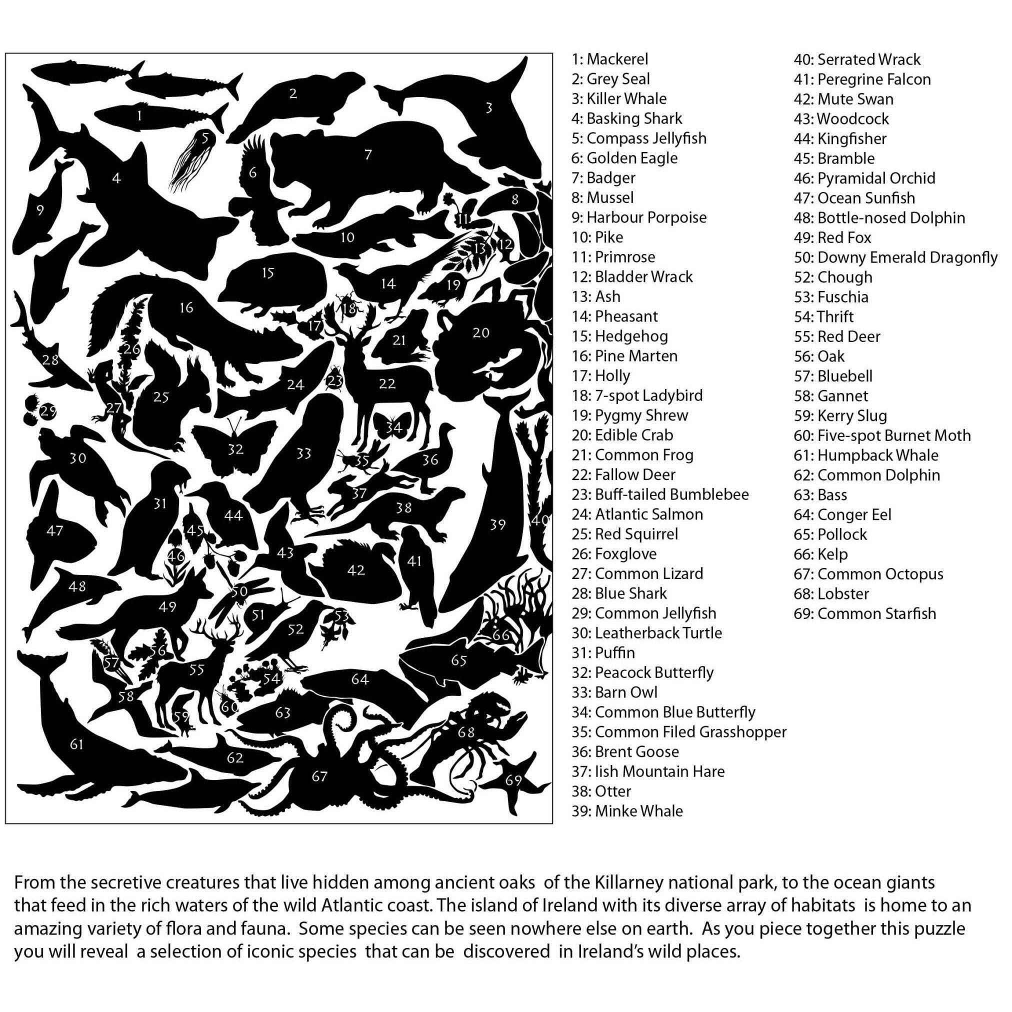 From the secretive creatures that live hidden among ancient oaks of the Killarney National Park, to the ocean giants that feed in the rich waters of the wild Atlantic coast. The island of Ireland with its diverse array of habitats is home to an amazing variety of flora and fauna. Some species can be seen nowhere else on earth. As you piece together this puzzle you will reveal a selection of iconic species that can be discovered in Ireland’s wild places.
