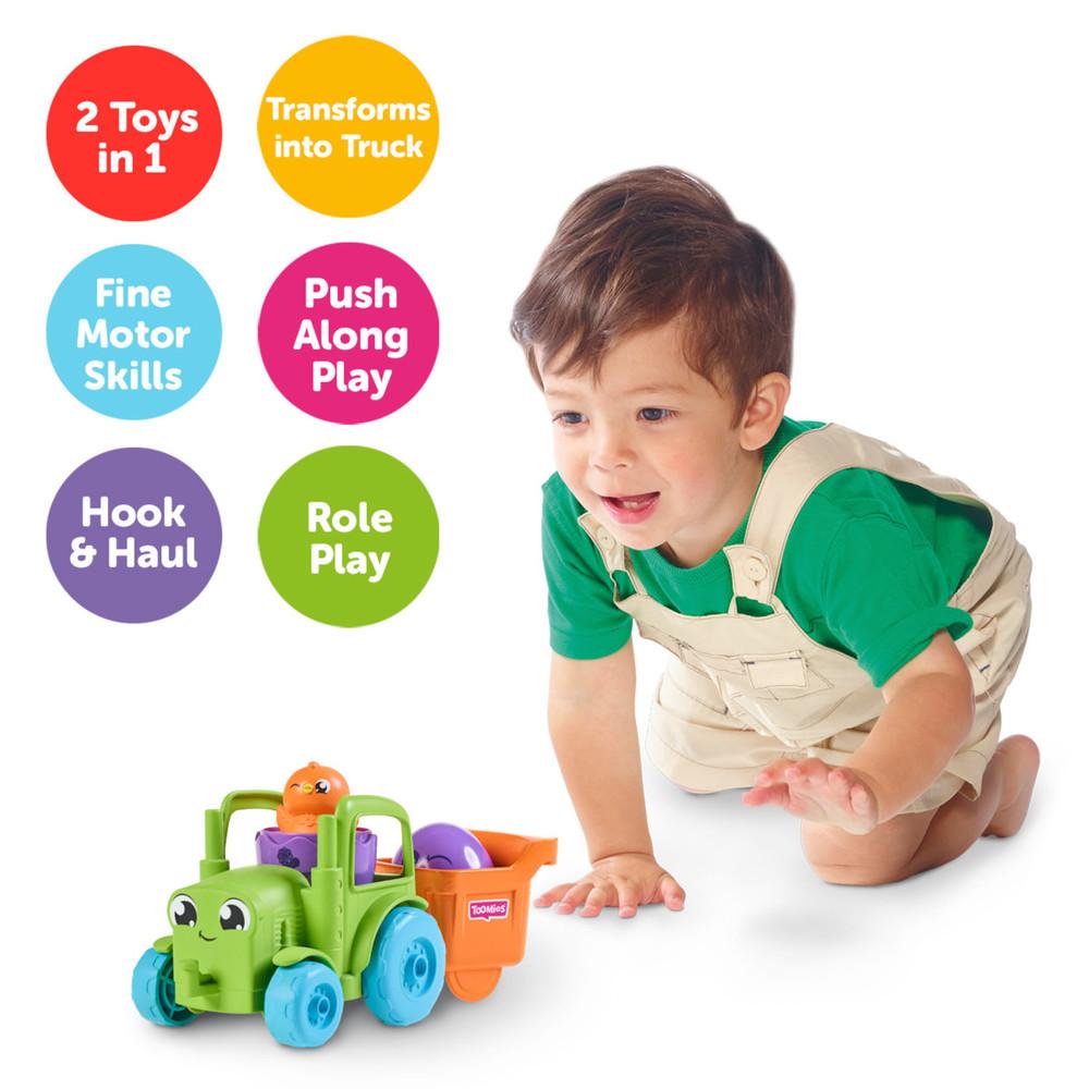 The 2 in 1 Transforming Tractor from Toomies is a clever toy in more ways than one. In fact, it’s more than just one toy! It’s a dumper truck with a tipper on the back that rests on a pair of hydraulic jacks. Lift off the tipper and hitch it round the other side and your truck turns into a tractor towing a trailer. Those jacks are now vertical exhaust pipes and the back wheels have become the front wheels. Like magic! It’s still the same toy but it can be totally transformed in seconds! So whether your little ones want fun on the farm or they’re crazy about construction, this colourful push-along free-wheeling pal is up for both jobs. With it comes a happy cheeping chick driver that squeaks when you press down. Hide her inside her shell or pop her behind the wheel with her other half in the back. Children as young as 12 months will love the funny faces, bright colours and push-along play. Then, as they grow and develop new motor skills, they’ll discover more and more ways to play: mixing and matching the pieces, switching from truck to tractor, and adding to their collection of original Hide & Squeak® eggs whose different shaped bases also slot into place. Like other vehicles in the range, they all come with a universal hitch back and front for even more hook and haul fun.