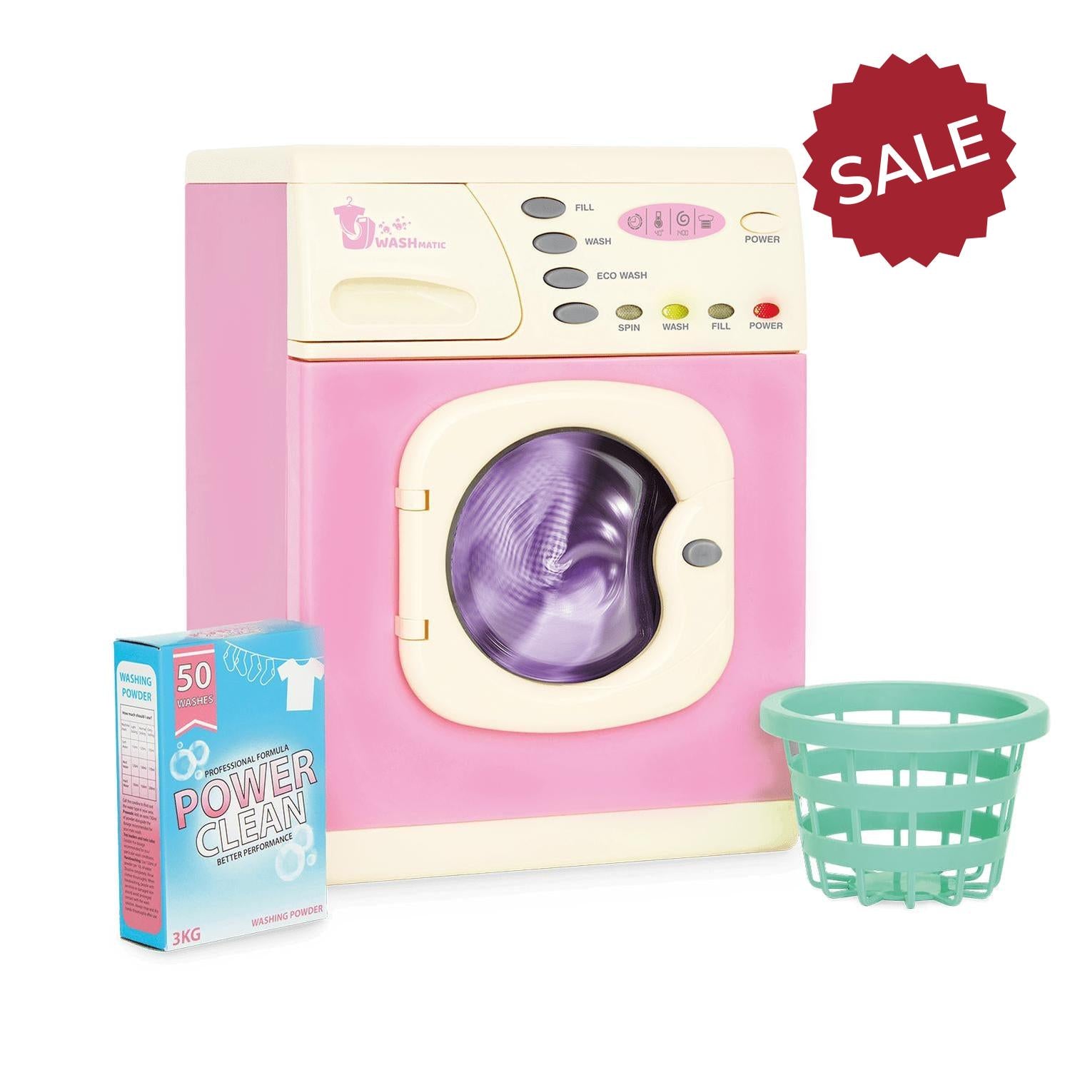 just like real washing machines, the pink washer has flashing lights and sound effects to signal when a load is done.