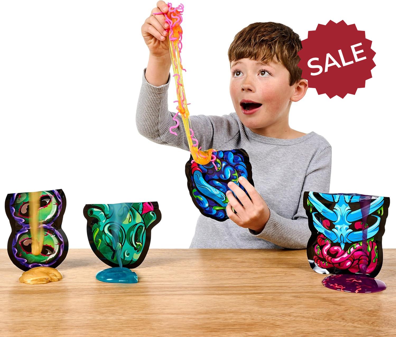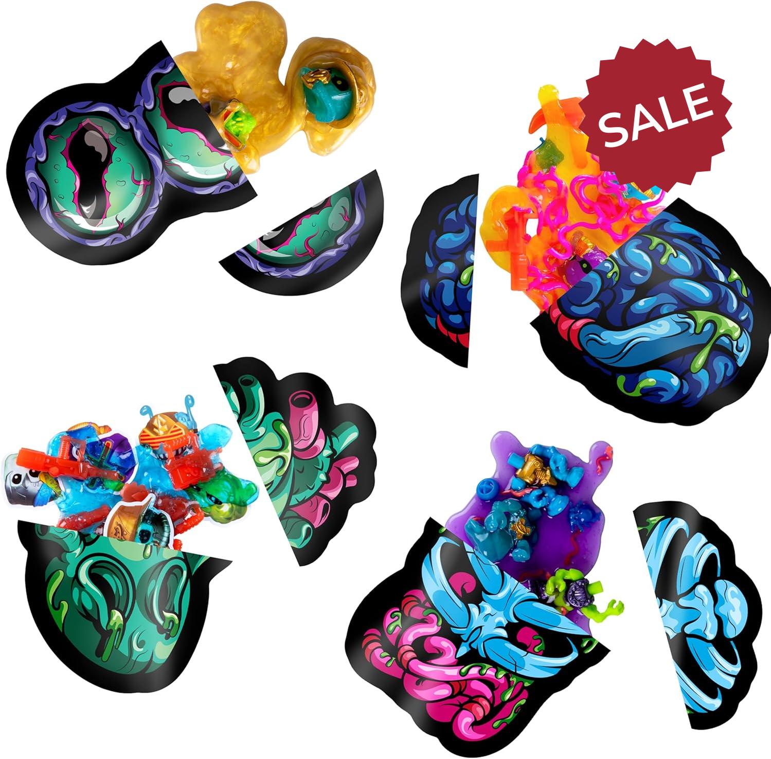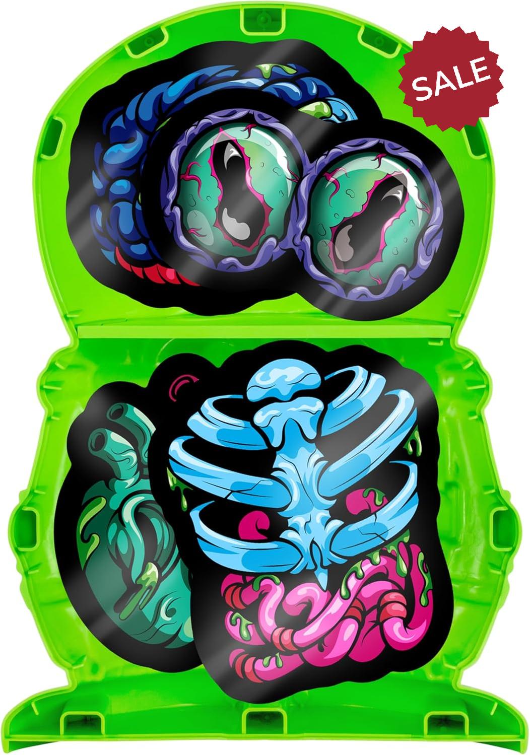 As kids dissect the alien, they'll encounter the intriguing array of 4 organs - heart, eyeballs, guts, and brain - each concealing Alien Treasure Hunters immersed in a captivating medley of oozy, squishy, and stretchy compounds. From snake-infested Alien Guts to noodle-ridden Alien Brain Ooze, the tactile experience of exploring Alien Eyeball Golden Goo and Alien Heart Slime adds an element of wonder to the adventure!