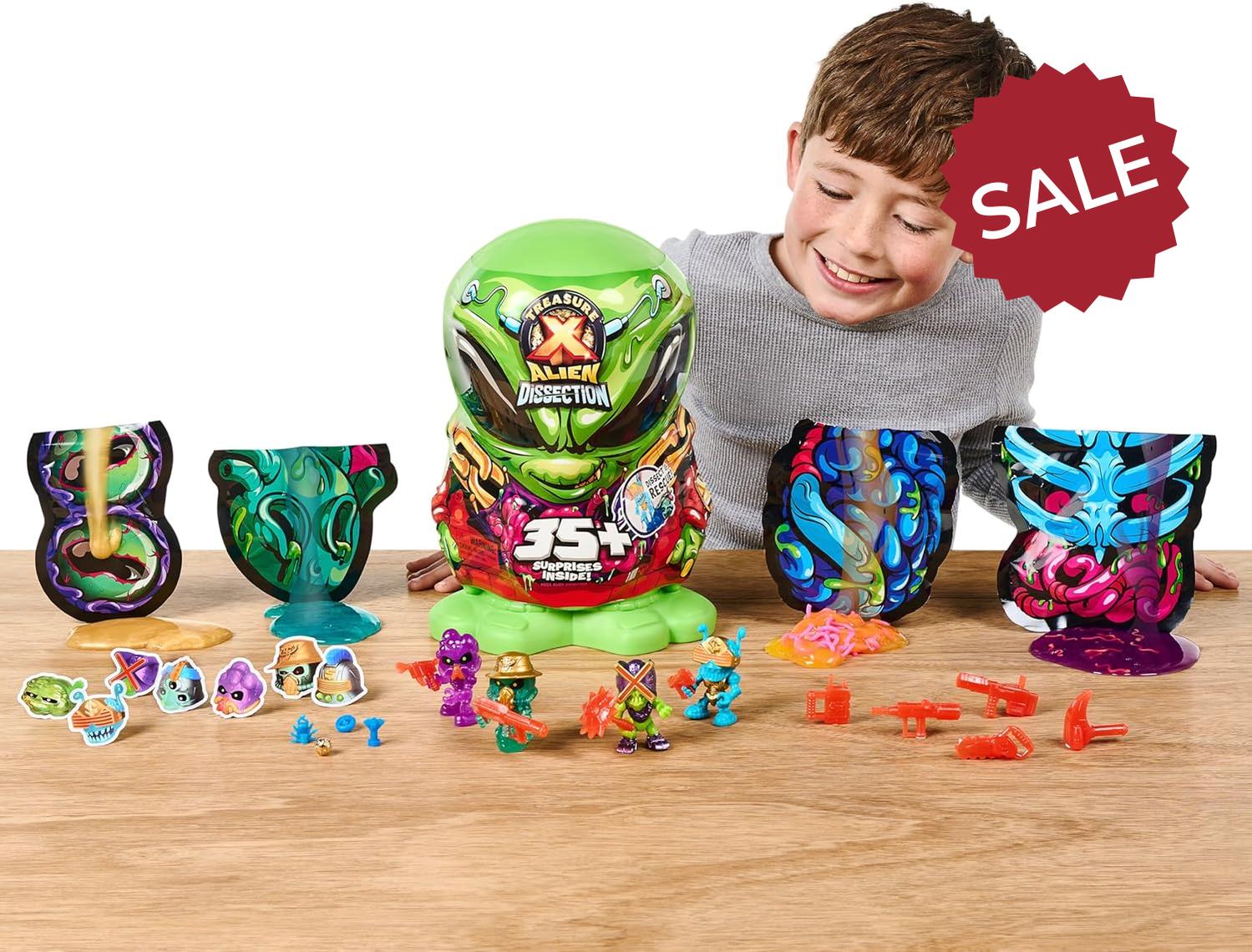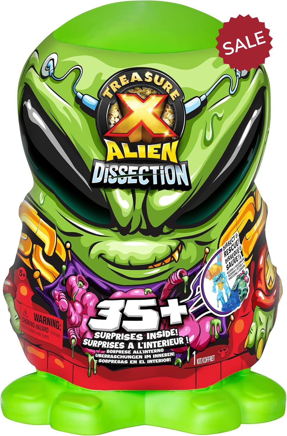 Dissect the 12' tall alien's organs to rescue 4 Alien Treasure Hunters. Discover 9 different alien weapons, 7 stickers plus 4 alien treasures! Will your child find a REAL Gold Dipped Treasure?