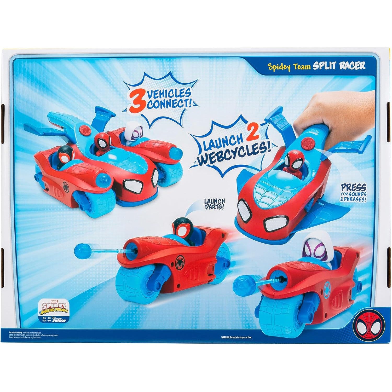 Press down on each of their heads to launch a Web Dart at any baddies in the way. Finally, press the trigger on the Spidey jet to pop out its wings and activate more sounds. When its time to regroup, attach both motorbikes back on the jet and race off together again. The Spidey Team Split Racer is inspired by the hit show Spidey and His Amazing Friends.