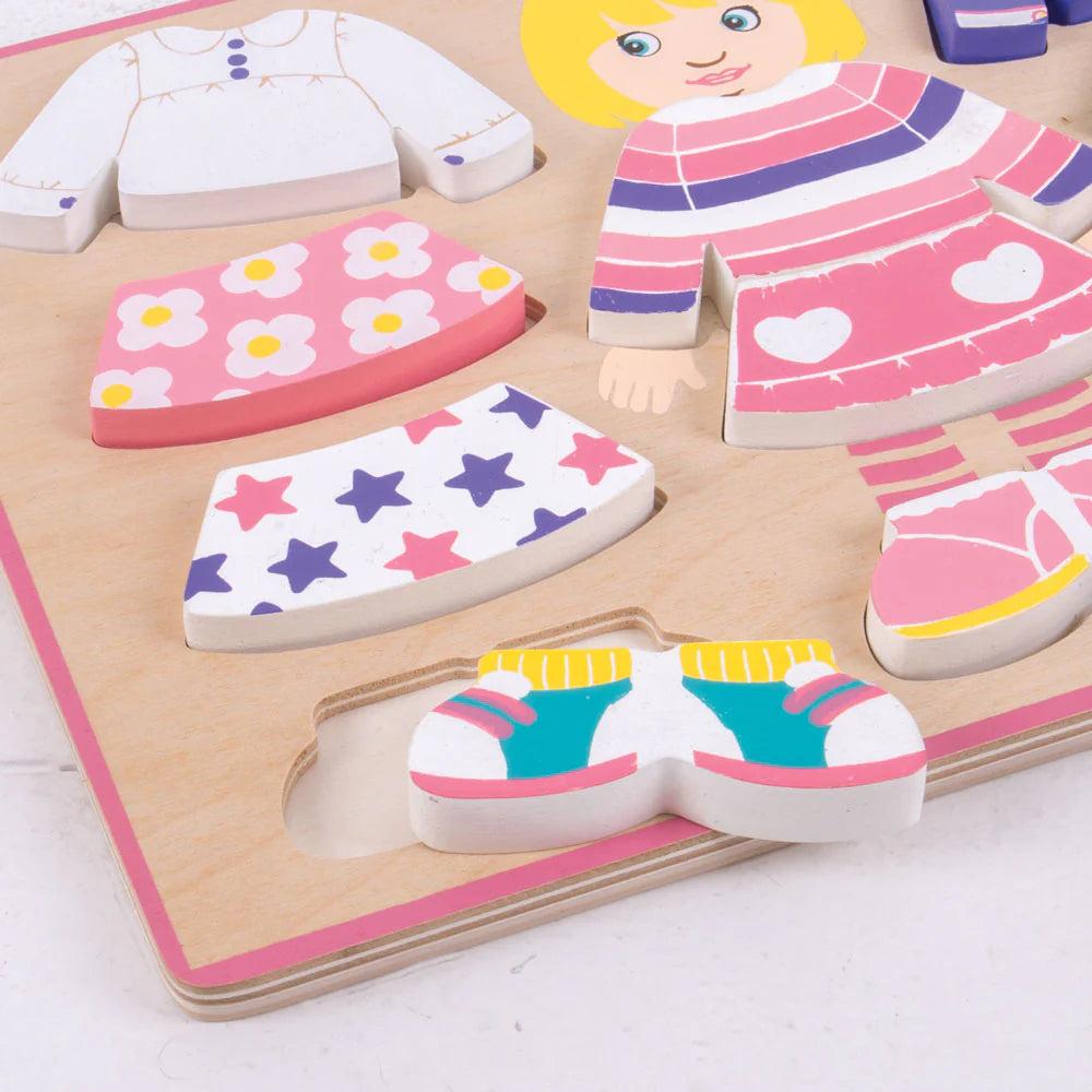 Match the brightly coloured wooden pieces to the correctly shaped slot on the base board and learn all about clothes and getting dressed! Mix and match the pieces to find colour co-ordinated outfits. Bigjigs Toys wooden puzzles help to develop vocabulary and aid youngsters to recall words as they recognise shapes, colours and images. Each chunky wooden puzzle piece is generously sized to make it easier for little hands to lift, grasp, examine and replace. Helps to develop dexterity, matching skills and concentration. Made from high quality, responsibly sourced materials. Conforms to current European safety standards. 10 puzzle pieces.