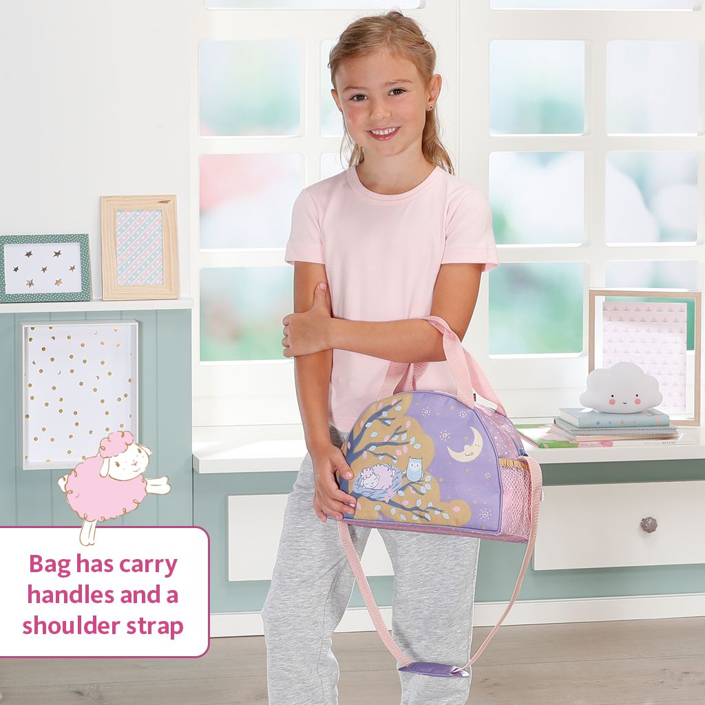 Featuring a Day & Night scene either side and shoulder strap for easy holding, our Changing Bag includes a changing mat, two pretend powder/cream pots, and a nappy.