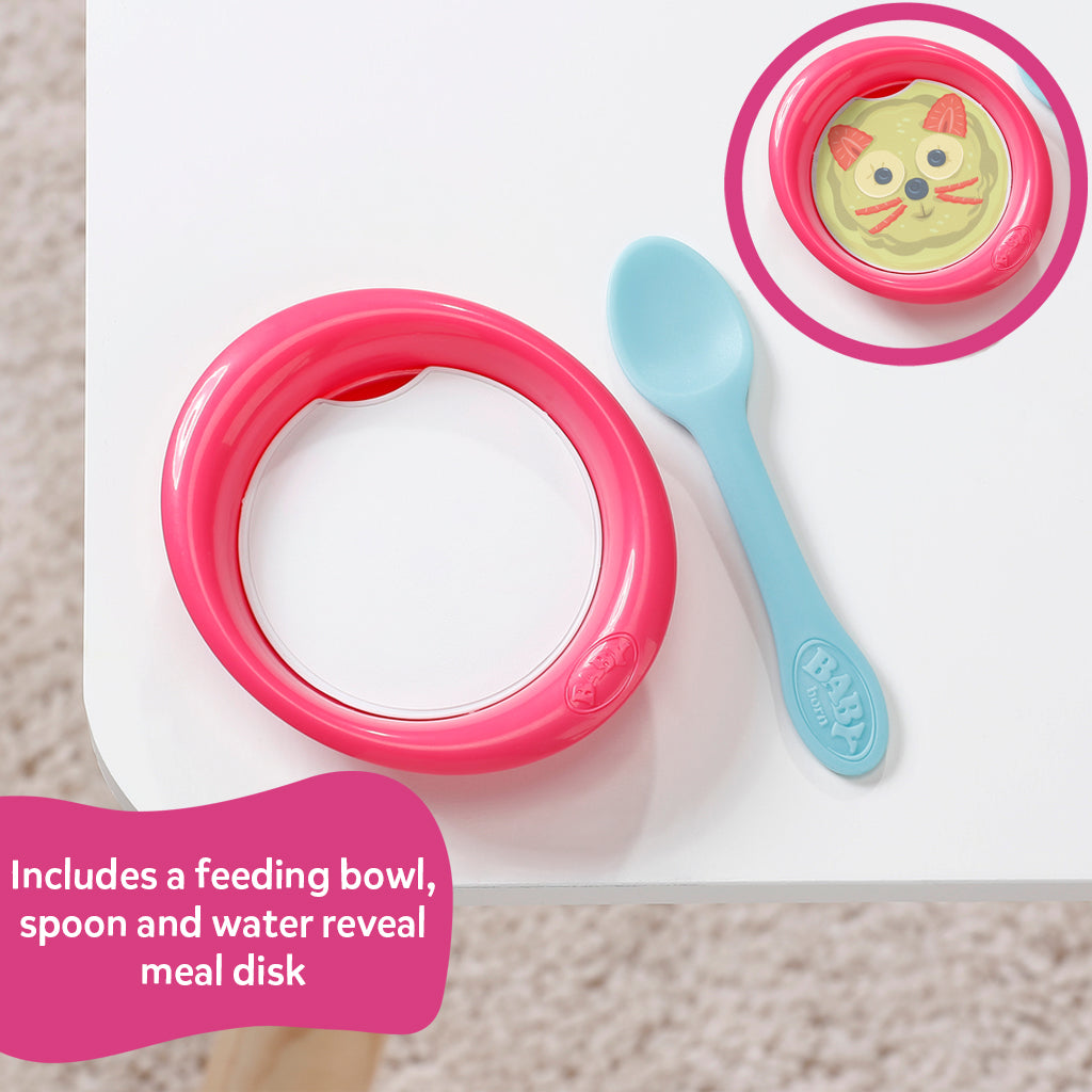 Each accessory is made with fun attention to detail, including the new Magic Plate – just use water to reveal a delicious meal for your BABY born or pop her on the potty after enjoying her meal and press her tummy to see her go to the toilet just like a big girl, the water will even reveal a poop in her potty!