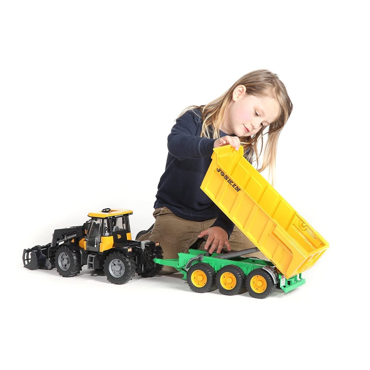 Bruder Joskin tipping trailer. Stabilising leg to drop, tipping dump via telescopic arm to flap and fix, rear flap opens automatically during draining, rear flap to fix in various positions, corn port to open, 3-axle chassis and sculptured tyres.