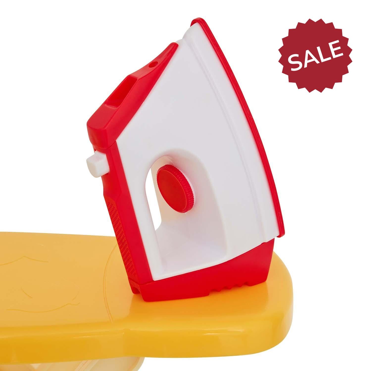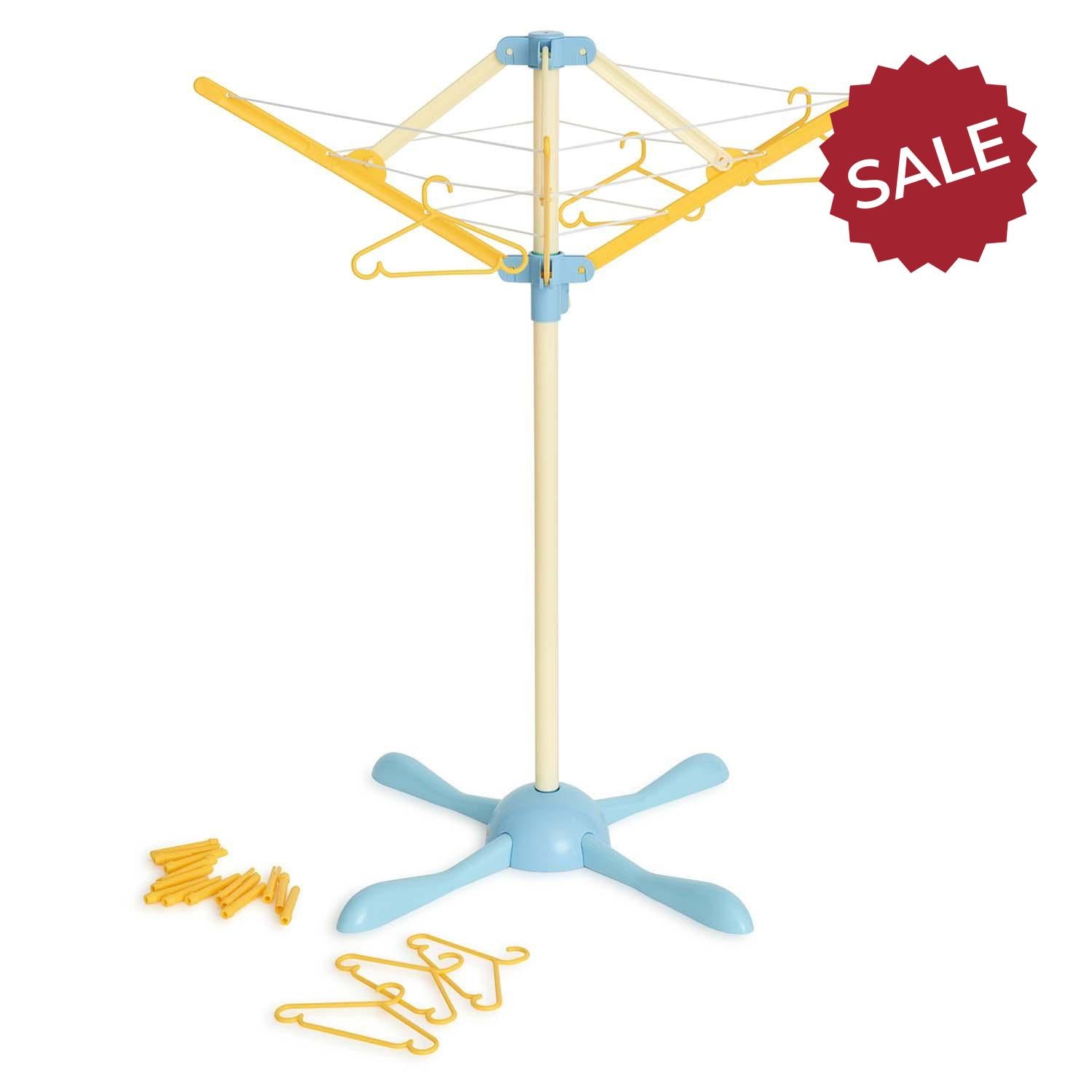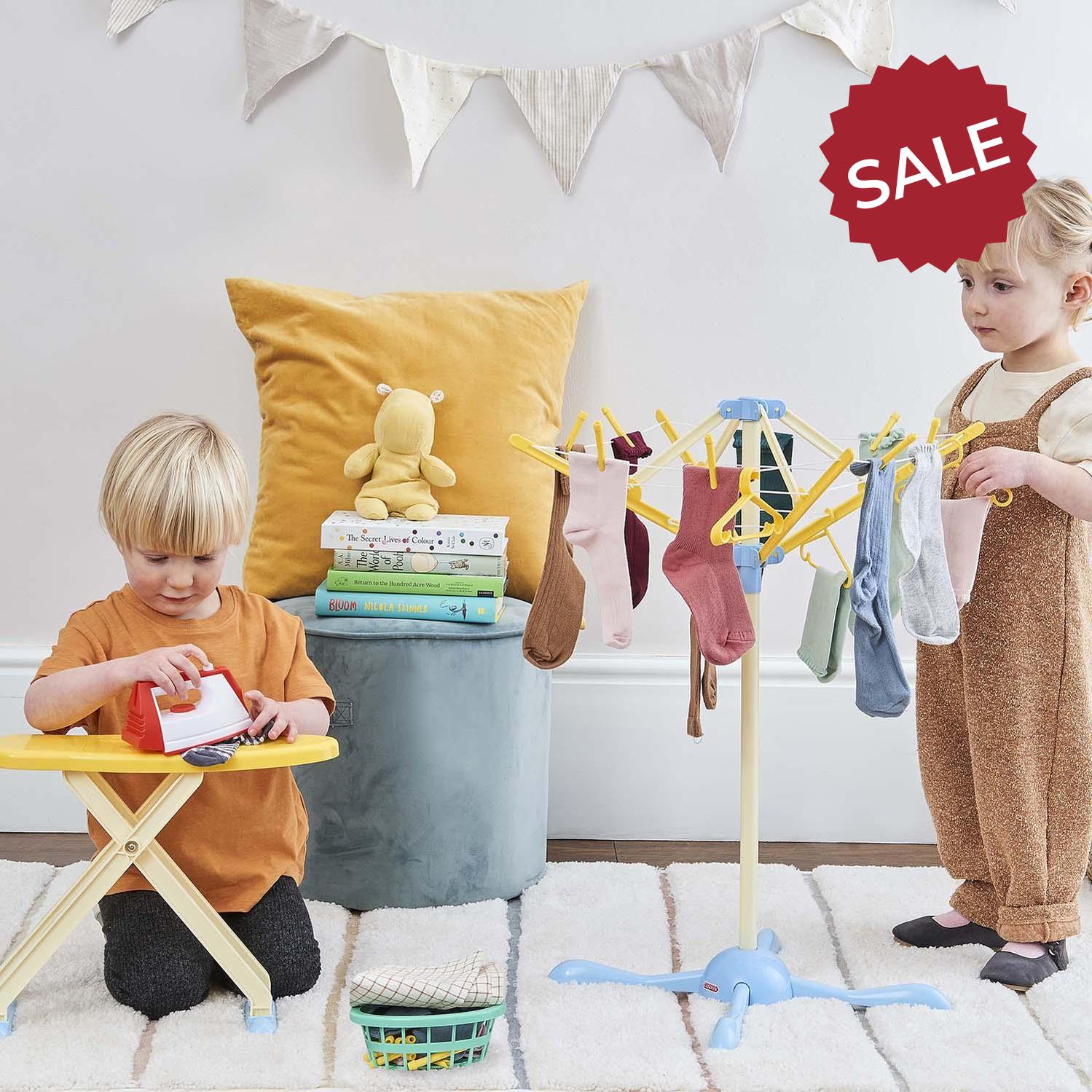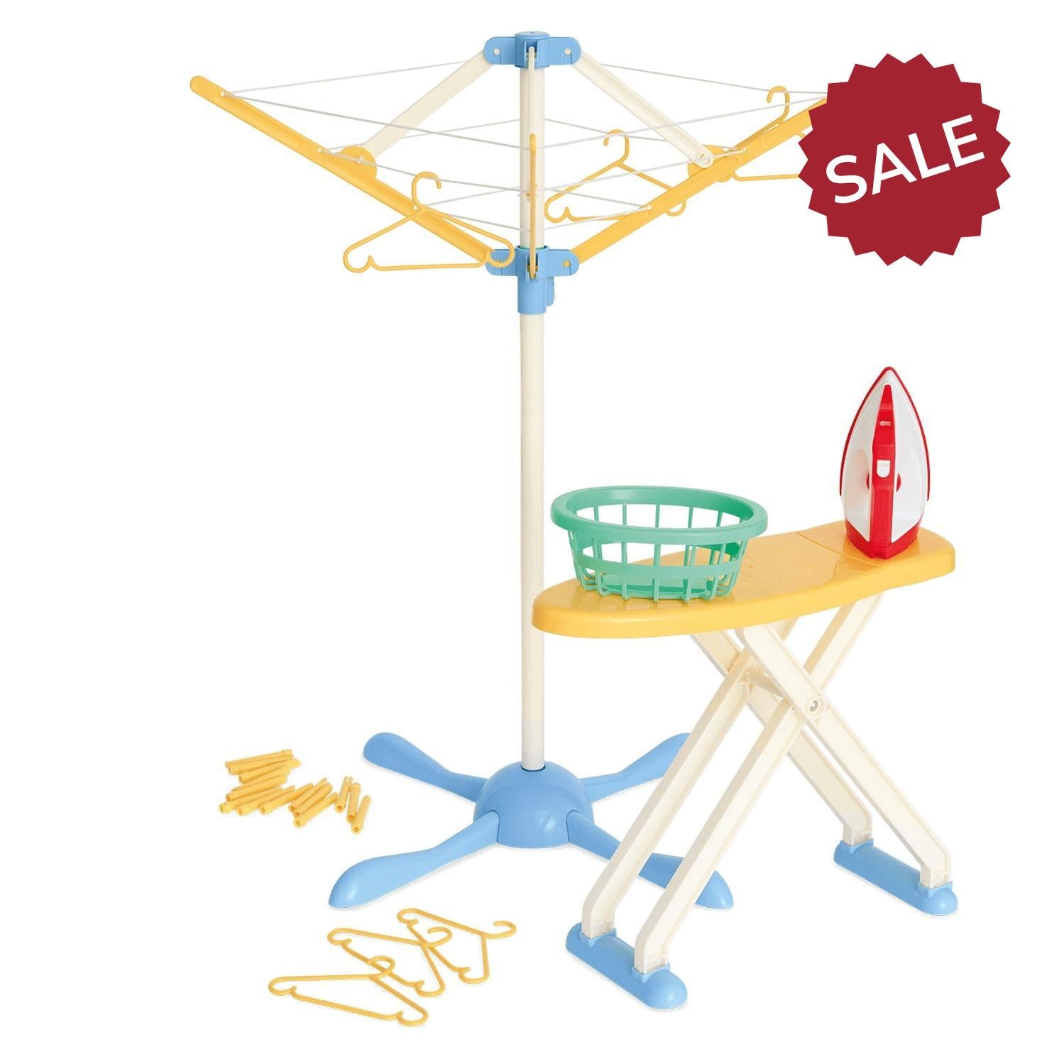 folding ironing board, rotary clothes airer, pretend steam iron, laundry basket, clothes pegs and hangers.