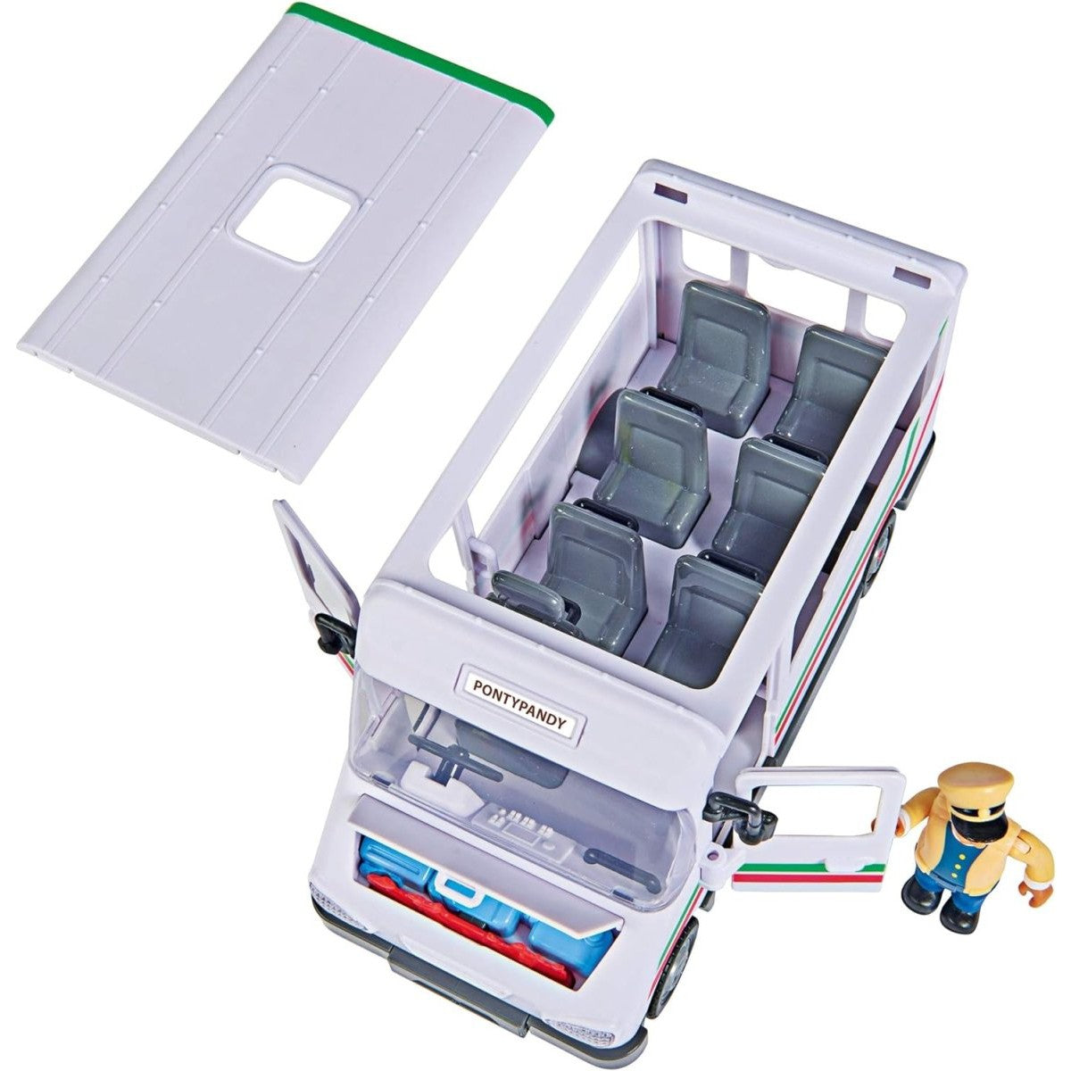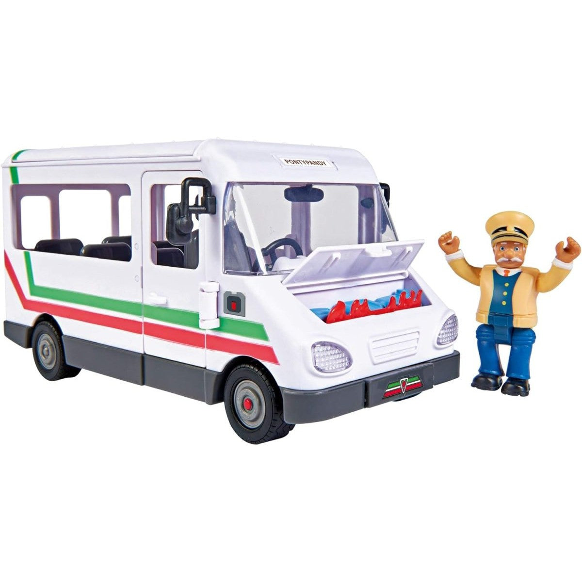 Fireman Sam and his team are often called to rescue Trevor from Pontypandy and his bus. If Trevor crashes his bus head-on into an object or wall, the bonnet springs open and flames appear. Depending on how the wheels are attached to the bus, the vehicle either travels in a straight line or the wheels wobble. The roof of the bus can be removed so that passengers can be easily placed into the seats.