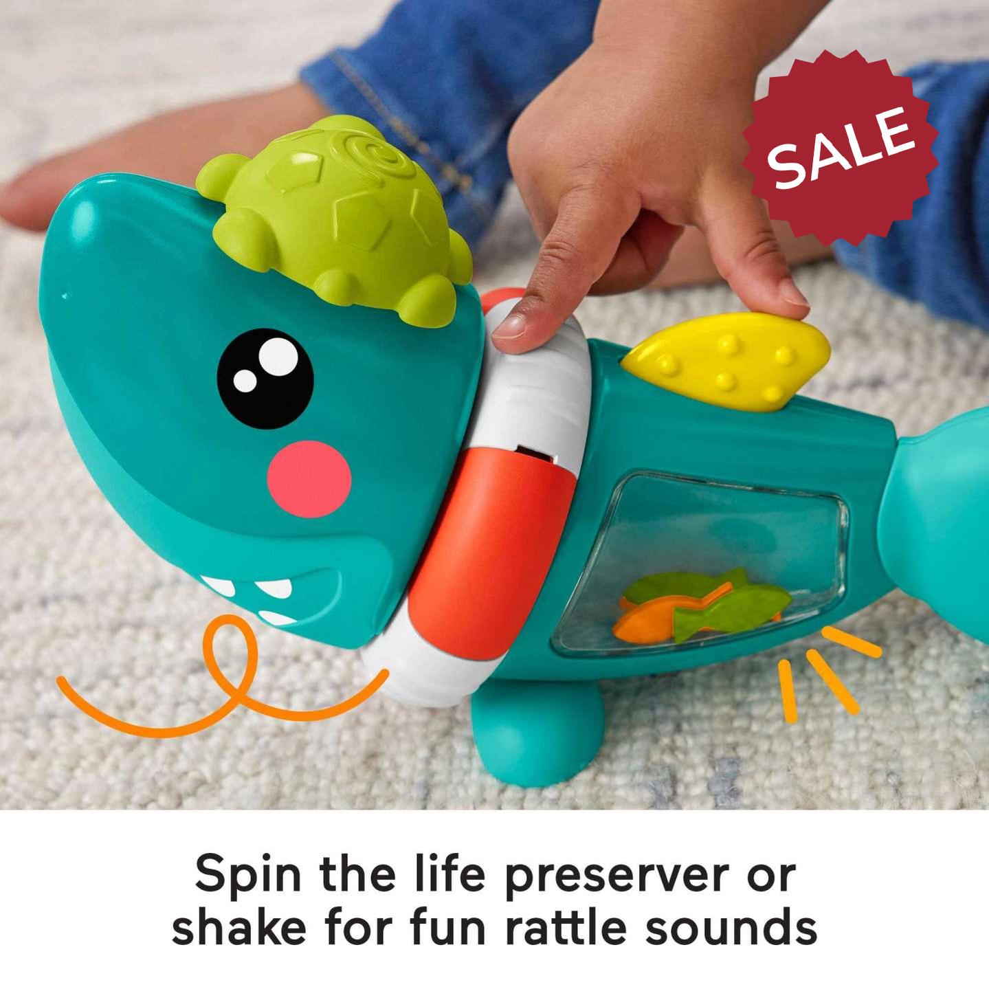Playtime becomes a high-seas adventure packed with hands-on play with the Paradise Pals Busy Activity Shark from Fisher-Price. This friendly shark features a variety of exciting activities for your baby to explore, including a tail clicker, life preserver ring spinner, a poppin’ turtle pal, and “fishy” rattle beads for shake-em-up fun. All that “fin”-omenal hands-on play helps foster little ones’ dexterity, hand-eye coordination, and sensory skills. No batteries required.