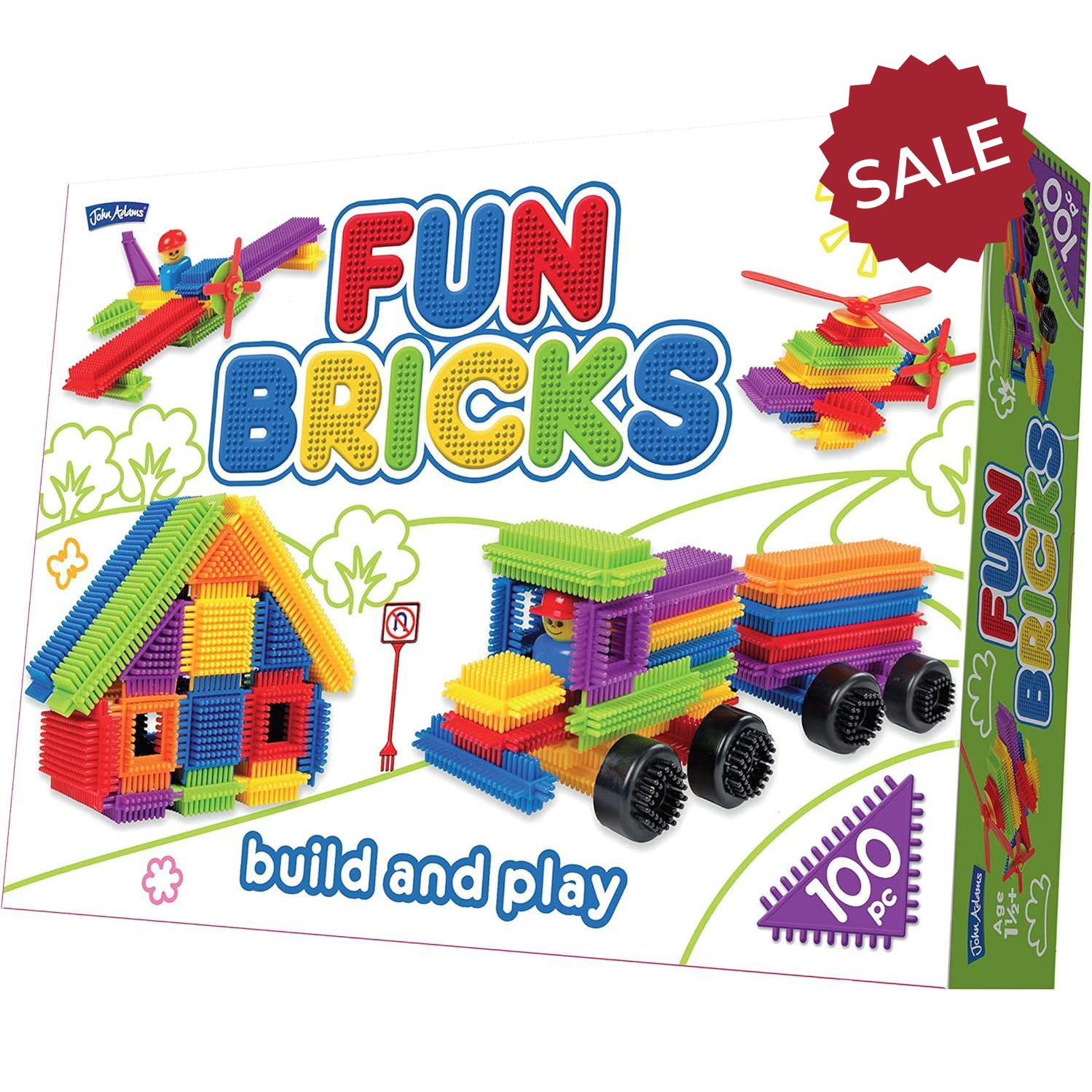 Fun Bricks is a range of building blocks for children aged 1 and a half and up. They help young children develop hand-eye co-ordination. These sturdy bricks in bright primary colours are perfect for little hands and big imaginations they easily fit together any way you like. The 100 pieces Fun Bricks set includes a range of different building blocks, with colourful characters.