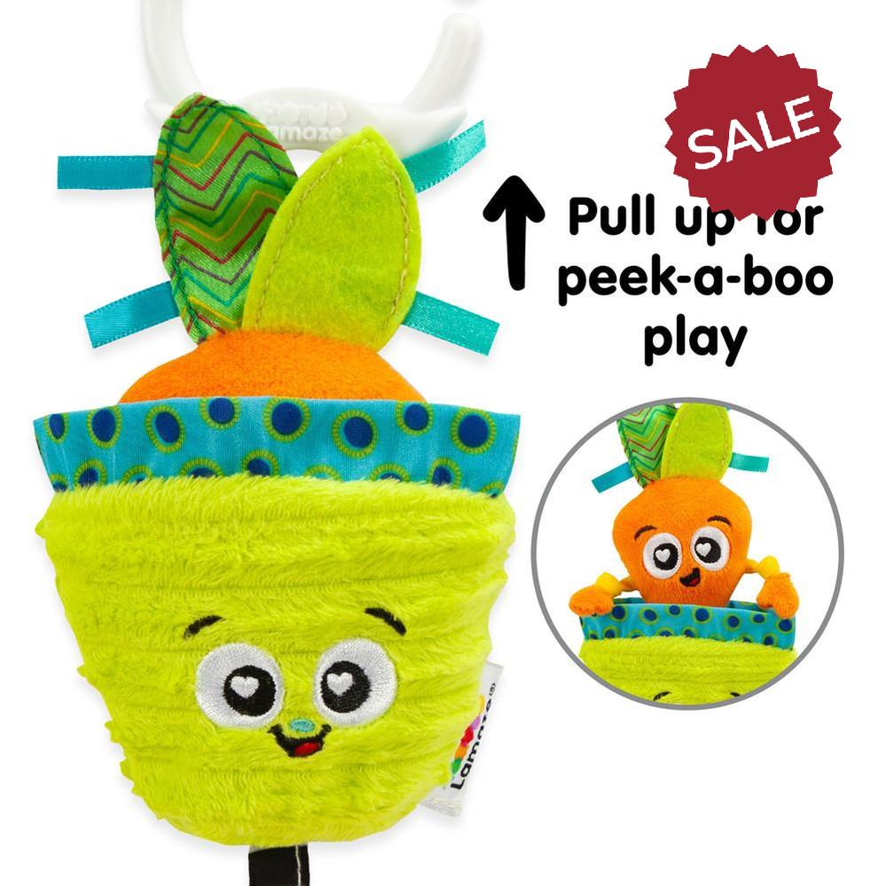 C is for carrot and this carrot is ripe for the picking! Pull the on the go clip and surprise. Peek a boo play teaches babies early on how things go away and come back again. It's never too early to talk about healthy snacks using Candy the Carrot.