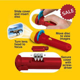 The torch comes with three slide discs with 24 colour photographs. Swap and change the slides easily by pulling back the plastic flap and inserting the chosen disc then rotate the disc round to view the fantastic colour images which project up to one meter wide. Images are easily focused by turning the lens head. It can also be used as a normal torch without the slides in place and is great for keeping on bedside tables to give comfort to children during the night. Measuring 11cm long and approximately 3.5cm in diameter at the widest point.