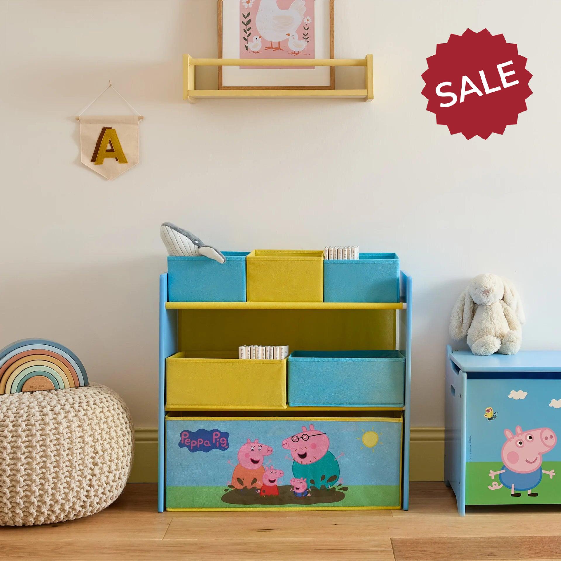 The Peppa Pig toy organiser is the perfect room accessory to keep things neat and tidy. The toy organiser is the ideal solution for keeping your child’s bedroom clutter-free by keeping all their toys in order. With a sturdy wooden frame and adorable Peppa Pig graphics the toy organiser include 6 storage bins, perfect for those small and large toys.