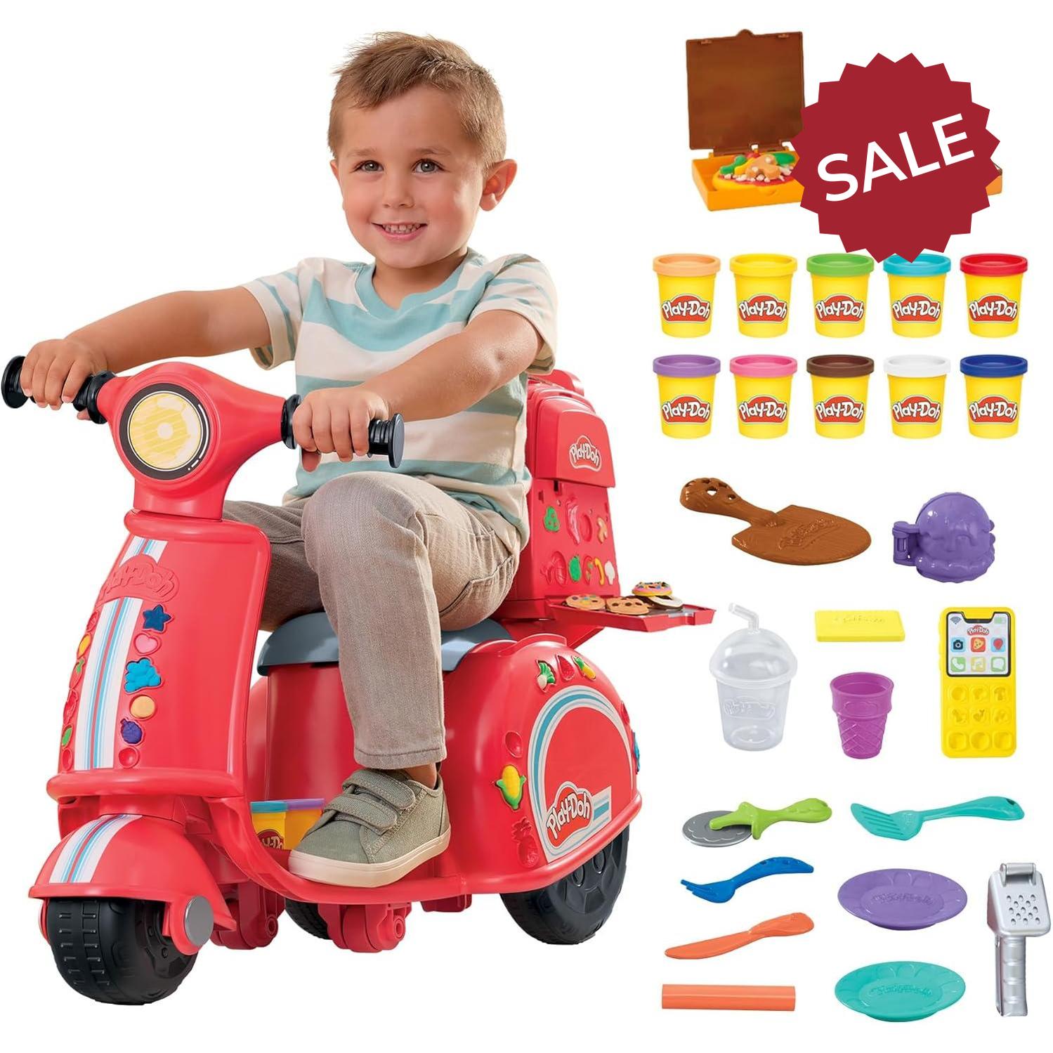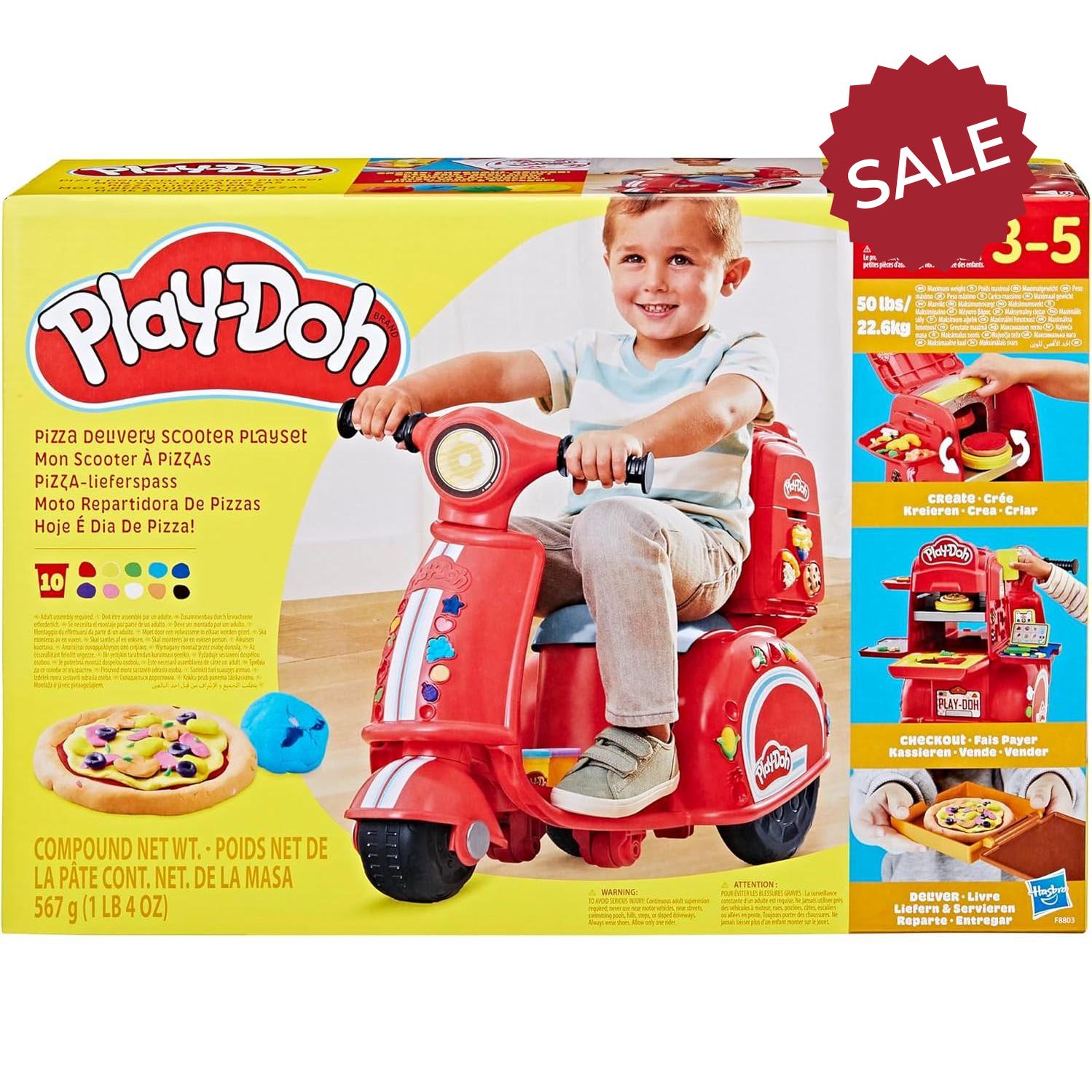 Unleash your child's creativity with this Play-Doh Pizza Delivery Scooter Playset for 3-5 year old children. This toy for girls and boys lets kids imagine running their own play food delivery business. This creative toy comes with a plastic scooter that doubles as storage for the variety of accessories that help children get their imagination going. With 10 cans of vibrant, non-toxic Play-Doh modelling clay, this Play-Doh set provides hours of fun, creative play for 3+ year old boys and girls. Designed for family gatherings, parties with friends, and school classroom activities, this Play-Doh set inspires children's imagination. This creative toy is a delightful choice for your collection of Play-Doh toys for kids. It offers engaging arts and crafts fun, sparking creativity in little ones. A fun gift idea for children aged 3 to 5, it’s sure to bring joy to any season.