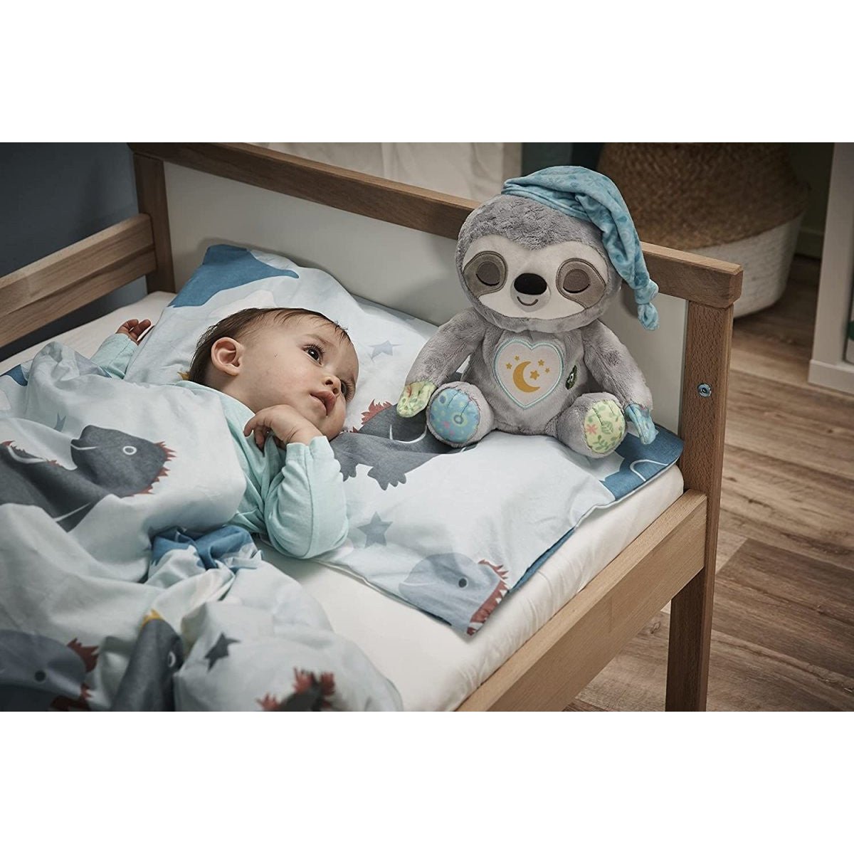 Meet the My Sleepy Sloth by VTech! This adorable and soft fabric sloth is ideal for soothing little ones at bedtime. My Sleepy Sloth plays soothing sing-along songs, peaceful melodies, relaxing bedtime story lullabies, calming phrases and gentle sounds, which ease little one when it's time to go to sleep. Various soft fabrics on My Sleepy Sloth allow for tactile stimulation and sensory discovery. Sloth's light up heart button triggers responses and acts as a nightlight with up to 45 minutes of sounds and melodies. Leaf button can pause and play music responses. There are 3 sing-along songs, 5 stories and 25 melodies in total.