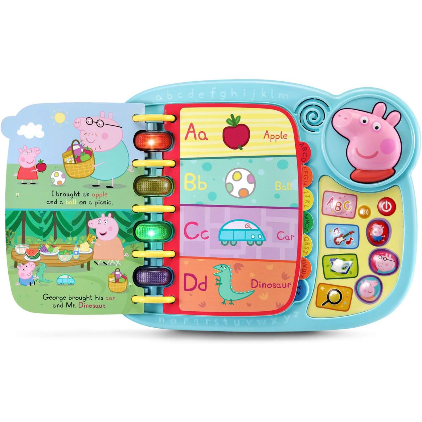 Explore Peppa's world with the Peppa Pig Learn & Discover Book! Listen to Peppa read her stories and introduce new words and the alphabet. Press the light-up buttons to explore the pages and learn with music and sounds.